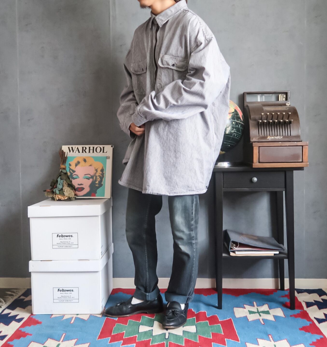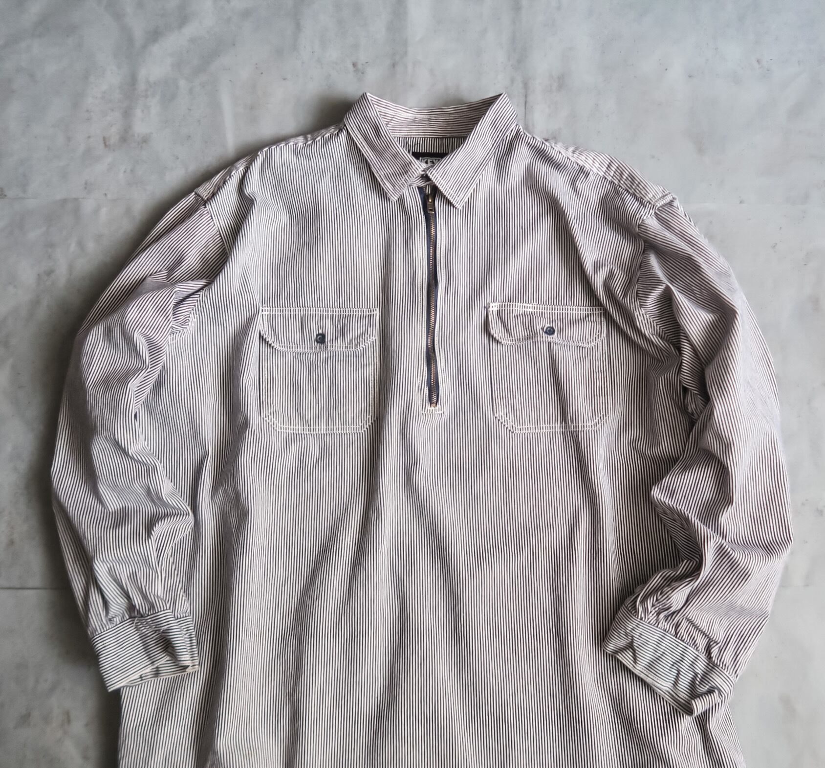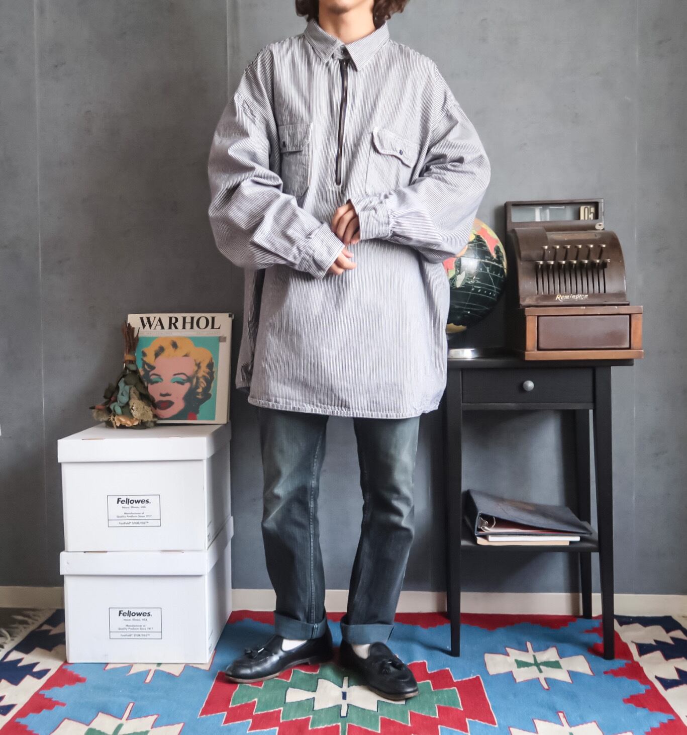 2000's KEY hickory stripe pattern bigsize halfzip cotton shirt