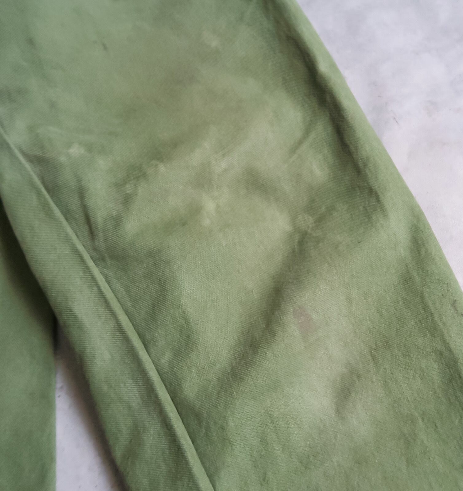 目の粗いコットン素材に、所々にあるリペアによって非常に良い雰囲気に仕上がった唯一無二な一本です。