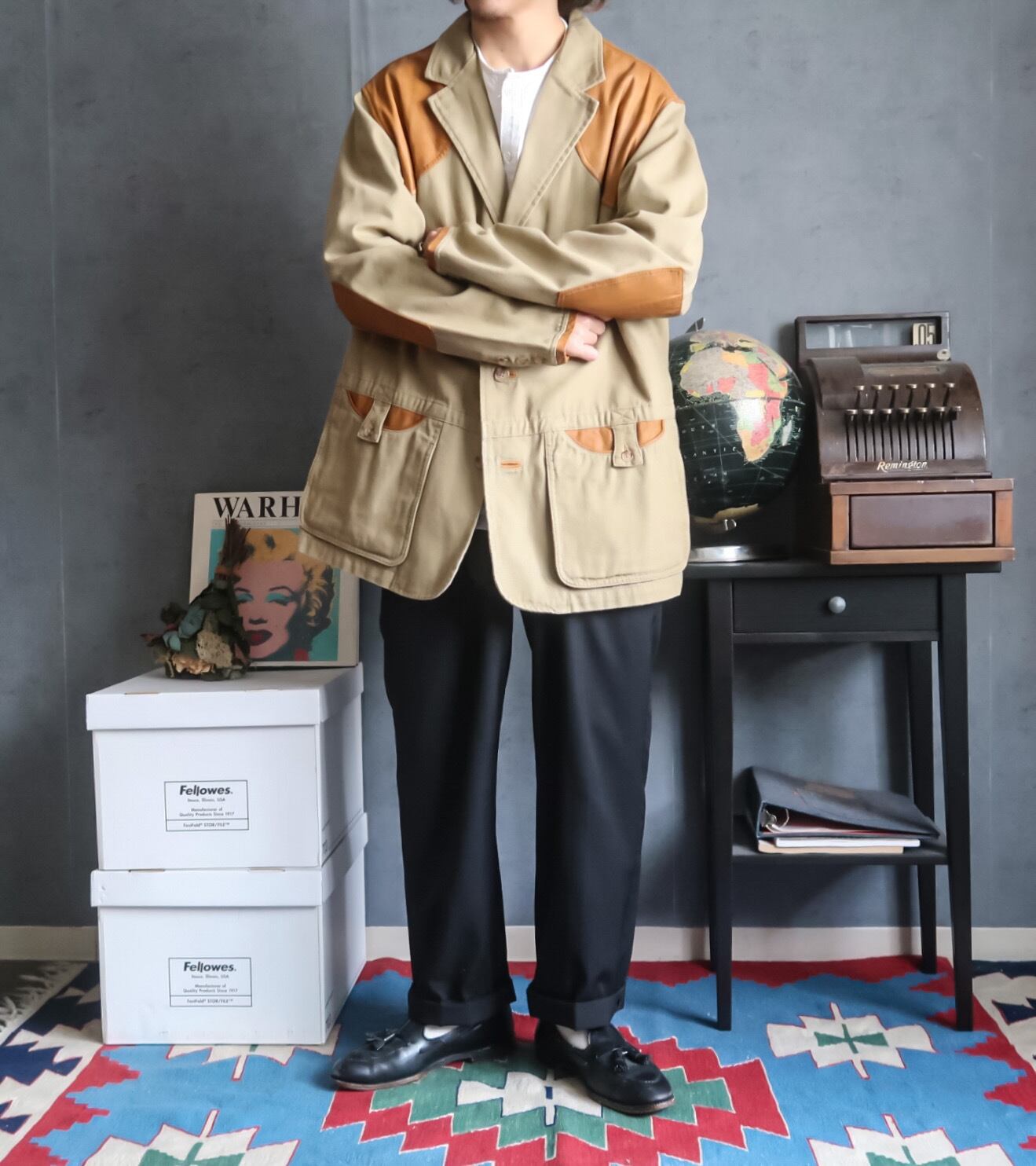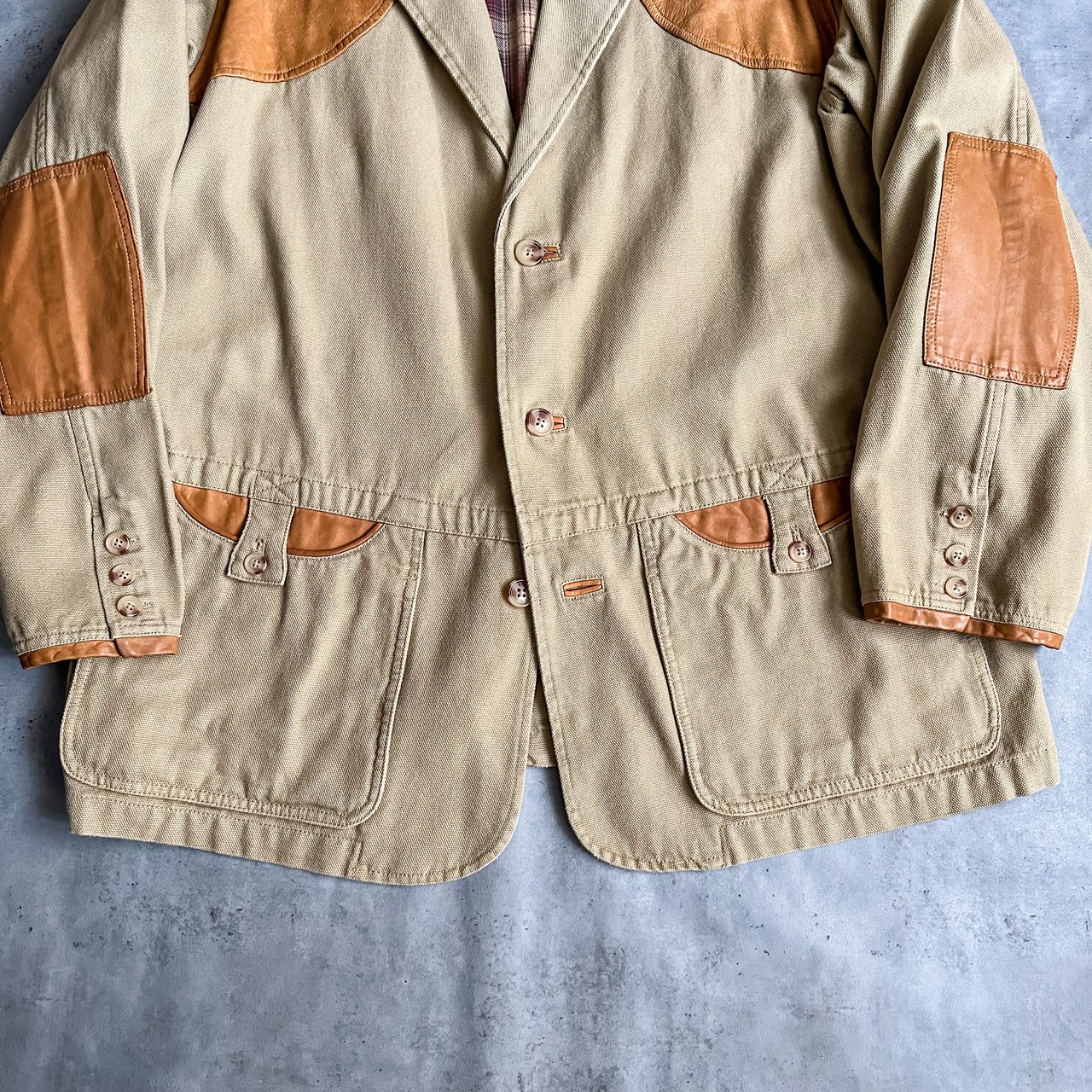 ベージュ系のコットン生地に、肩やエルボーパッチ、ポケットや袖のトリムなどレザーの切り替えになったスペシャルなデザイン。