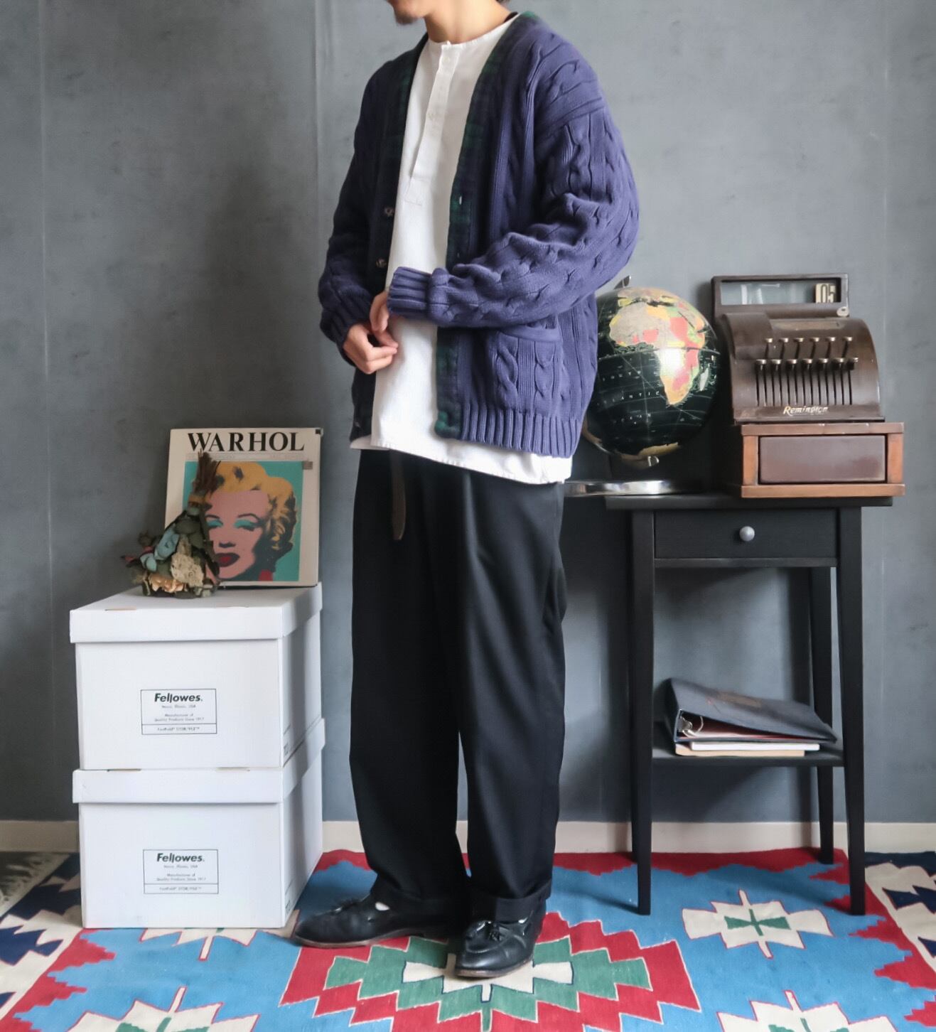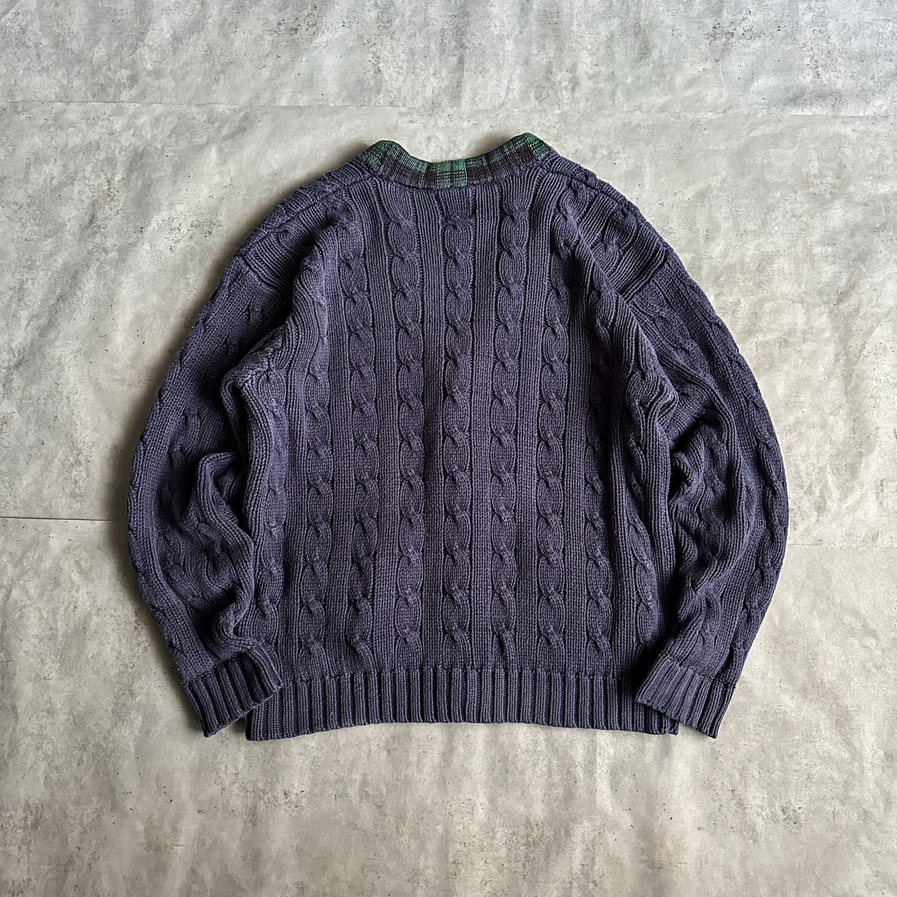 ケーブル編みのネイビーボディーに、襟から前立てにかけてチェック柄の切り替えになったグッドデザインな一着。