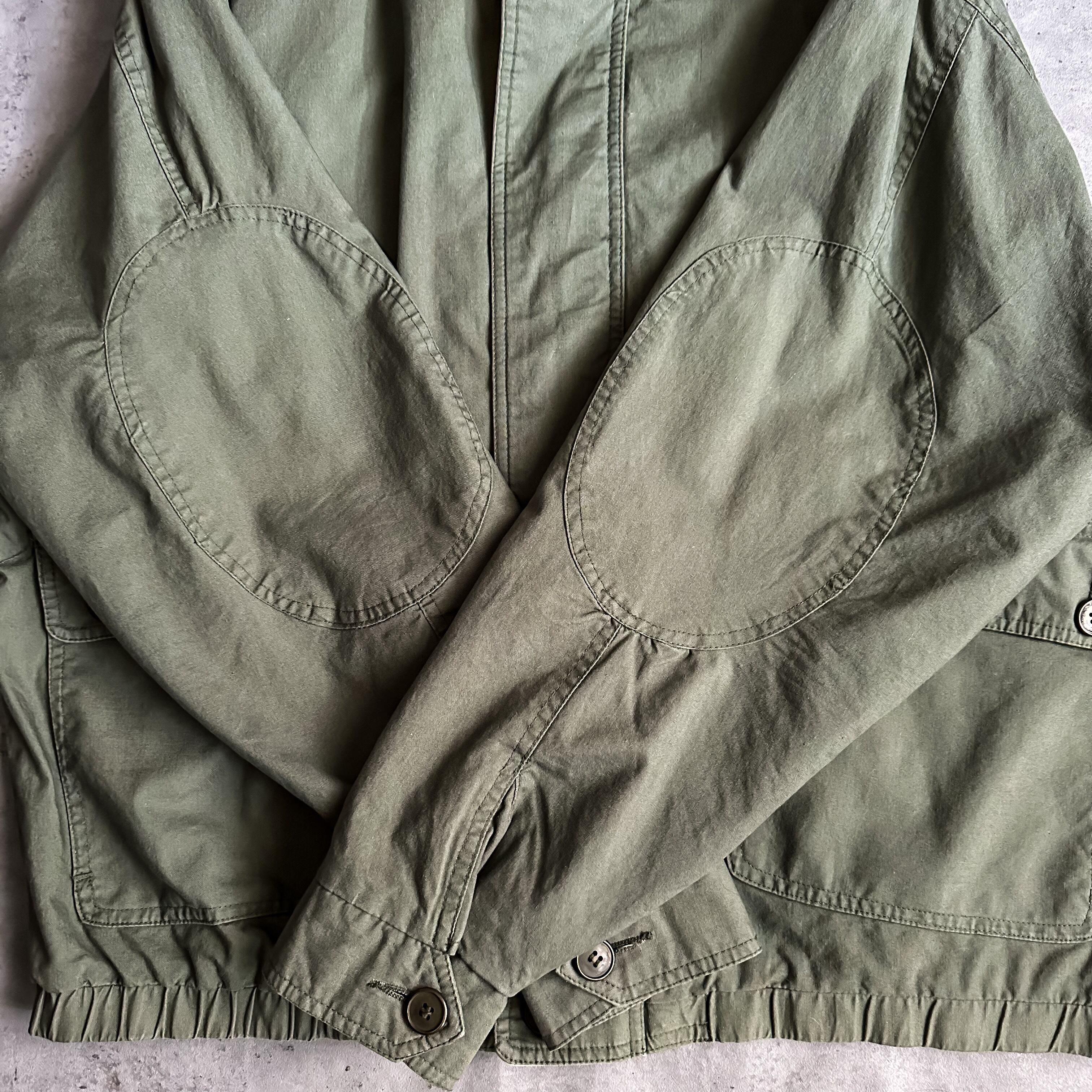 剥き出しボタンのポケットに比翼仕立て、そして襟周りはブラウンのレザートリムが施され、エルボーパッチまで付く素晴らしいディテールの詰まった一着です。