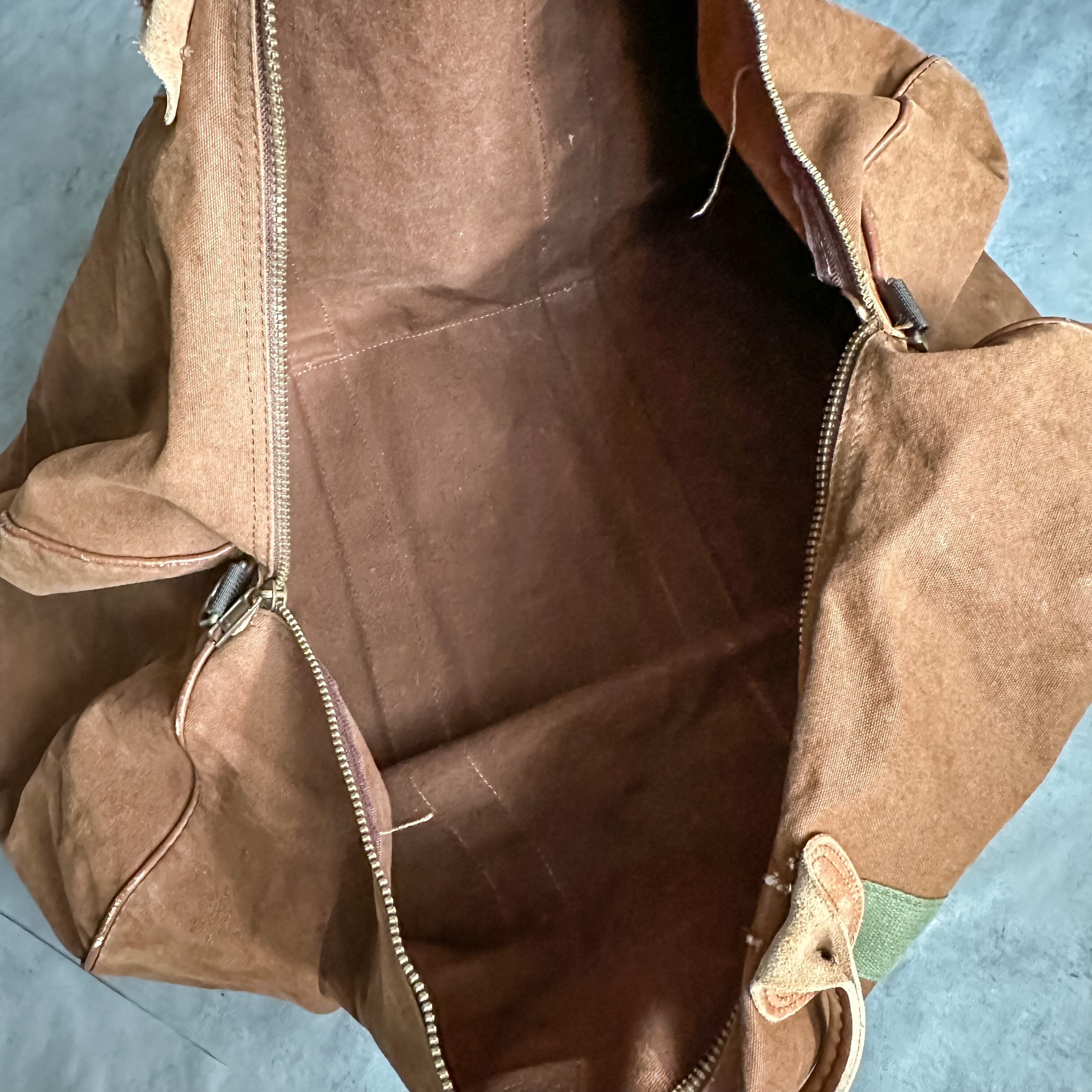 ブラウン×グリーンのコットンキャンバスボディに、底はフェイクレザーの切り替えでレザーハンドルとクオリティーの高いアイテムです。