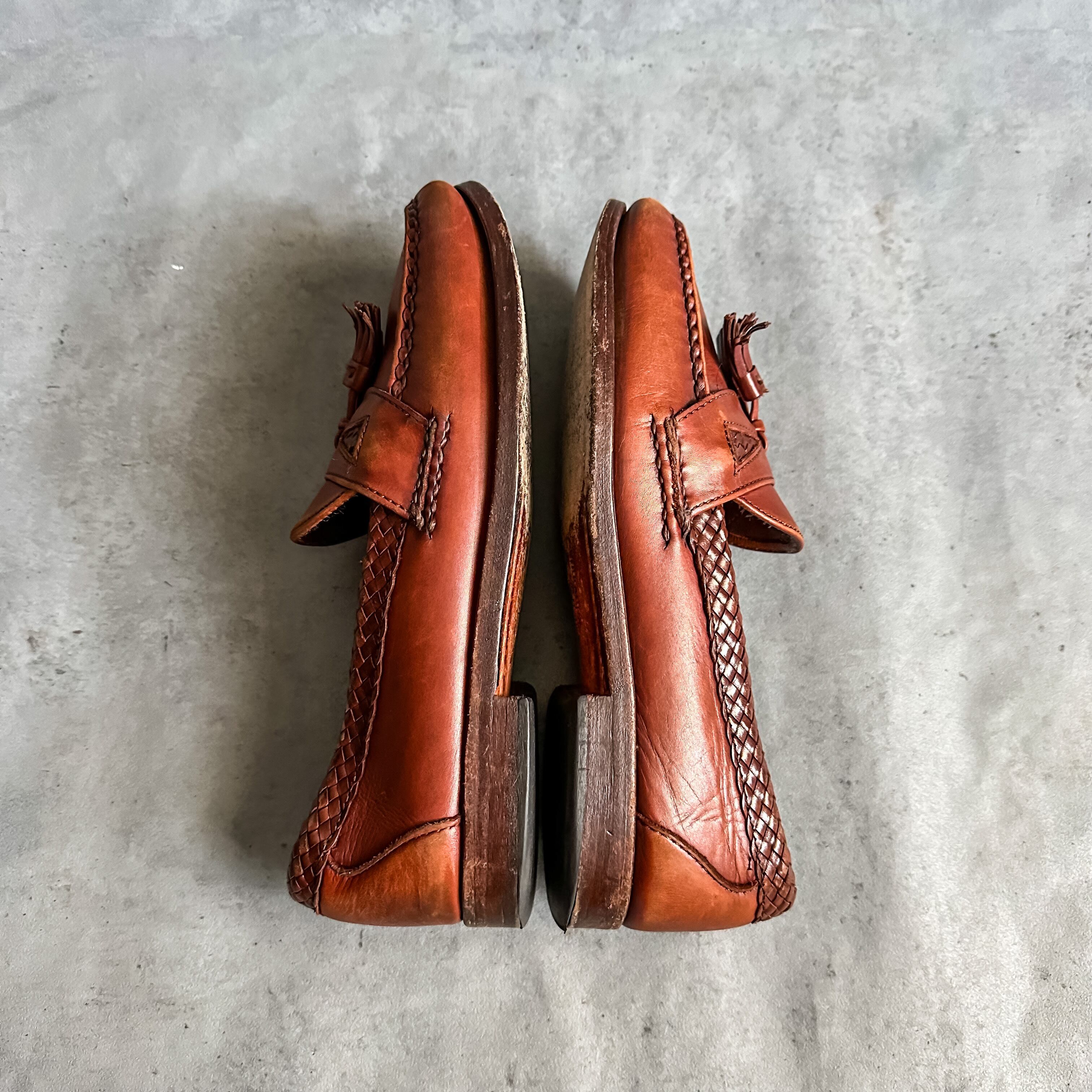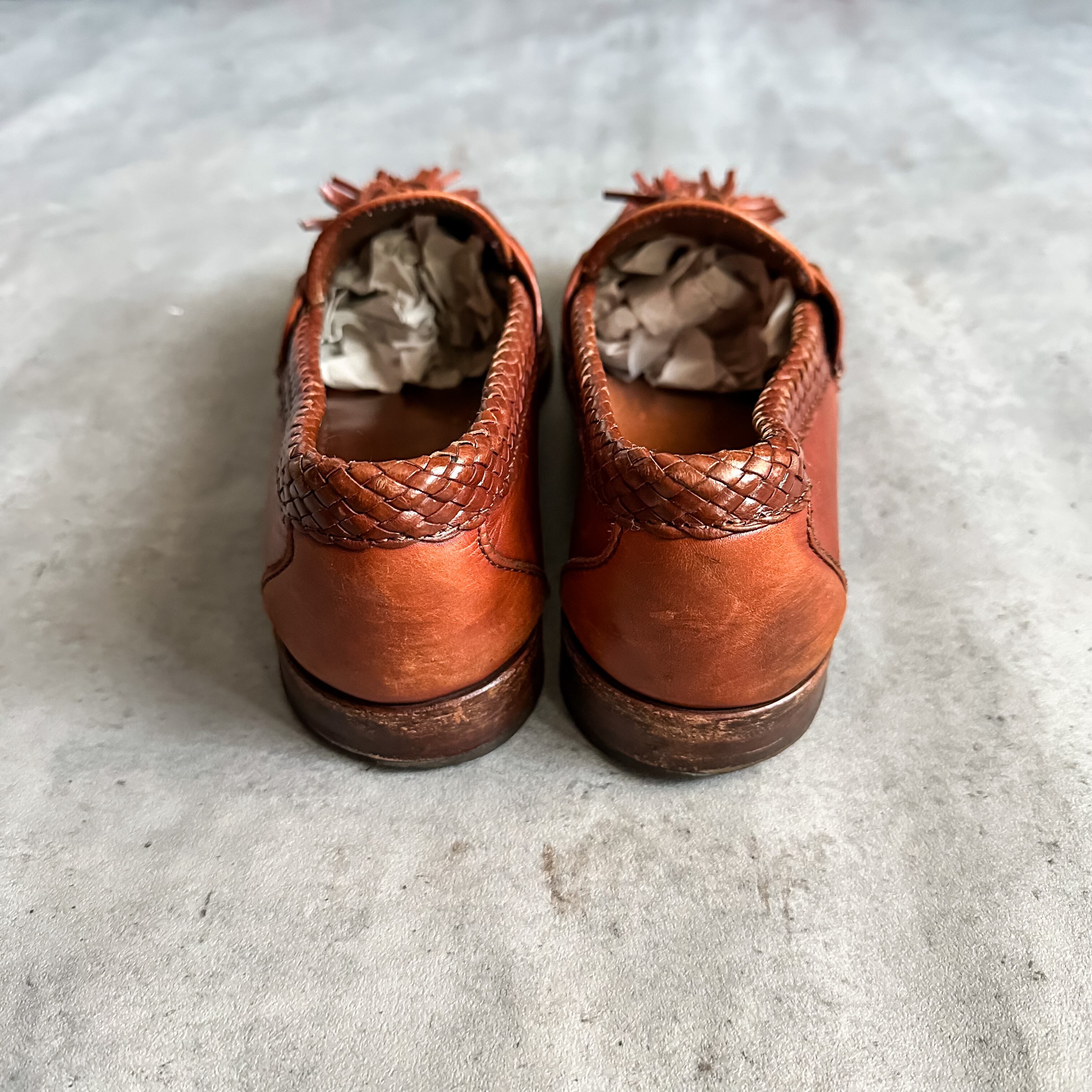 ブラウンカラーに編み込みとタッセルのコンビネーションで、ドレッシーな印象のあるデザイン性も高い一足。