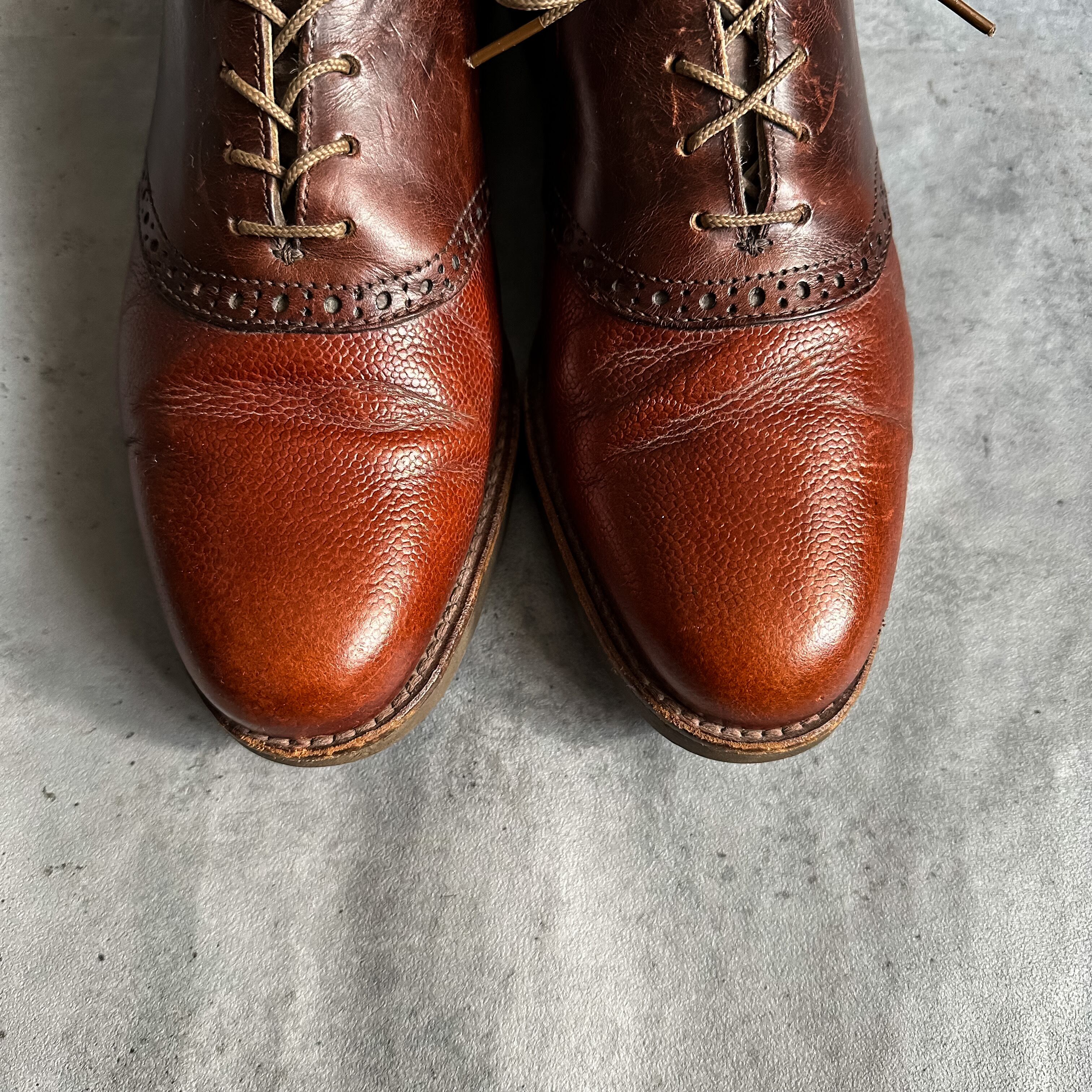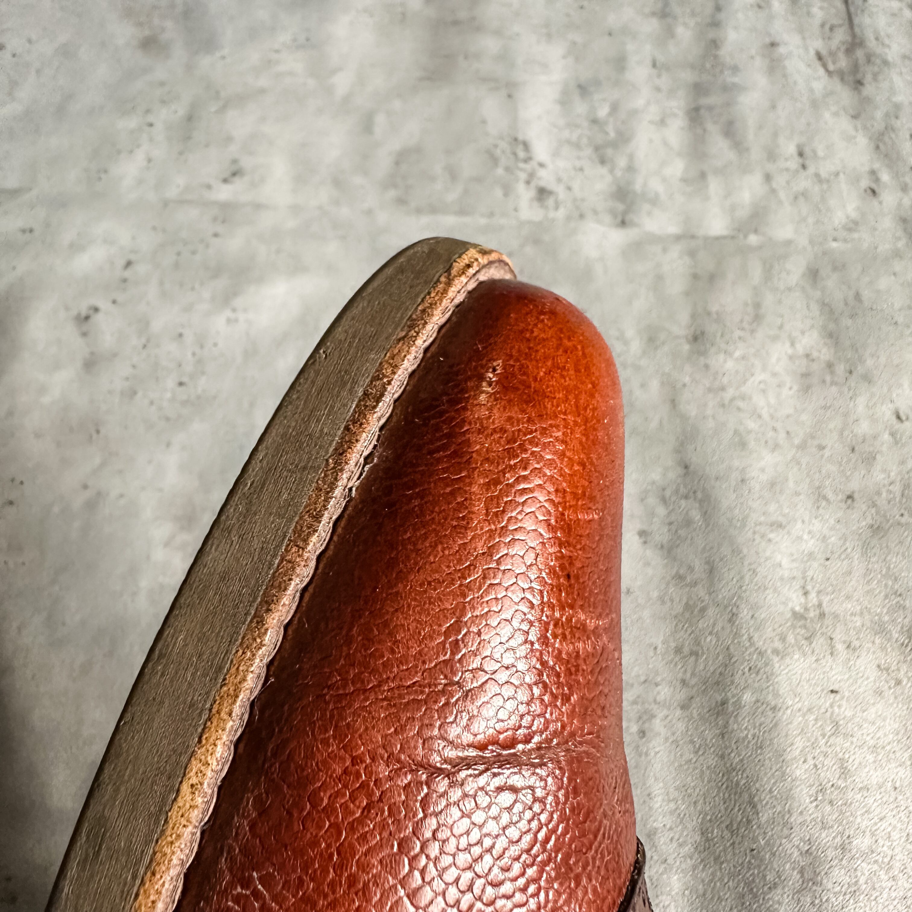 ブラウン系のツートンカラーに、シボ革とのコンビネーションが最高な一足です。