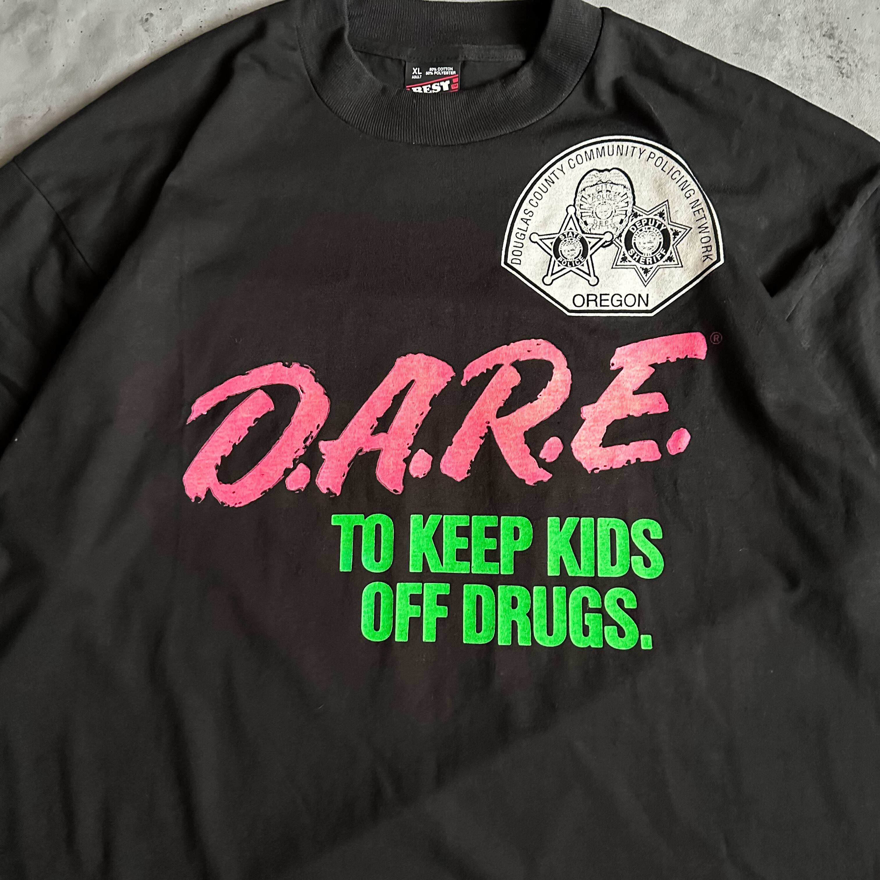 D.A.R.E.とはDRUG ABUSE RESISTANCE EDUCATIONの略で、子ども達を薬物乱用から守る教育をするアメリカの団体がチャリティーの為に作ったTシャツ。