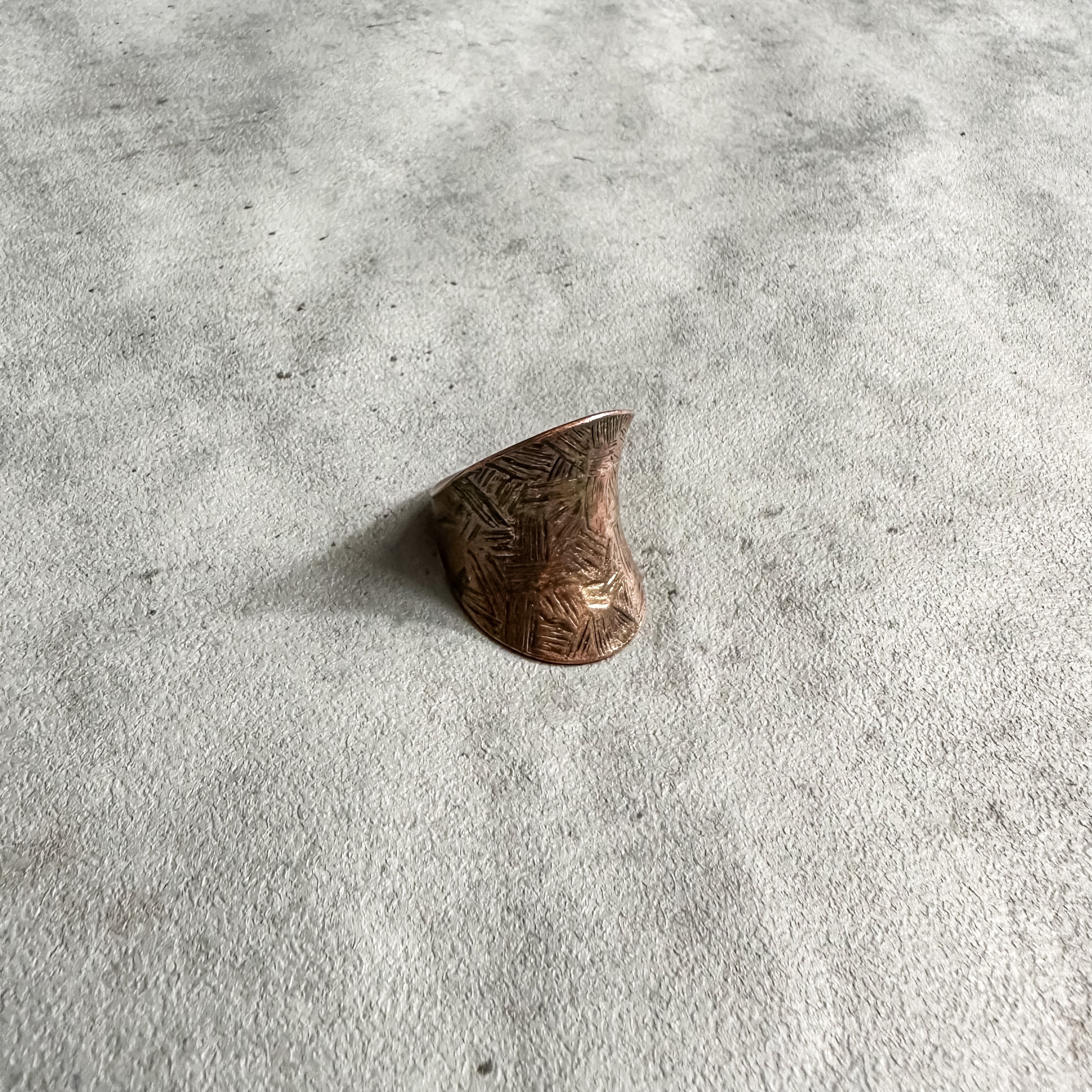 ブロンズのようなカラーリングに、ストライプ状に彫りのようなデザインが入るグッドなアイテム。