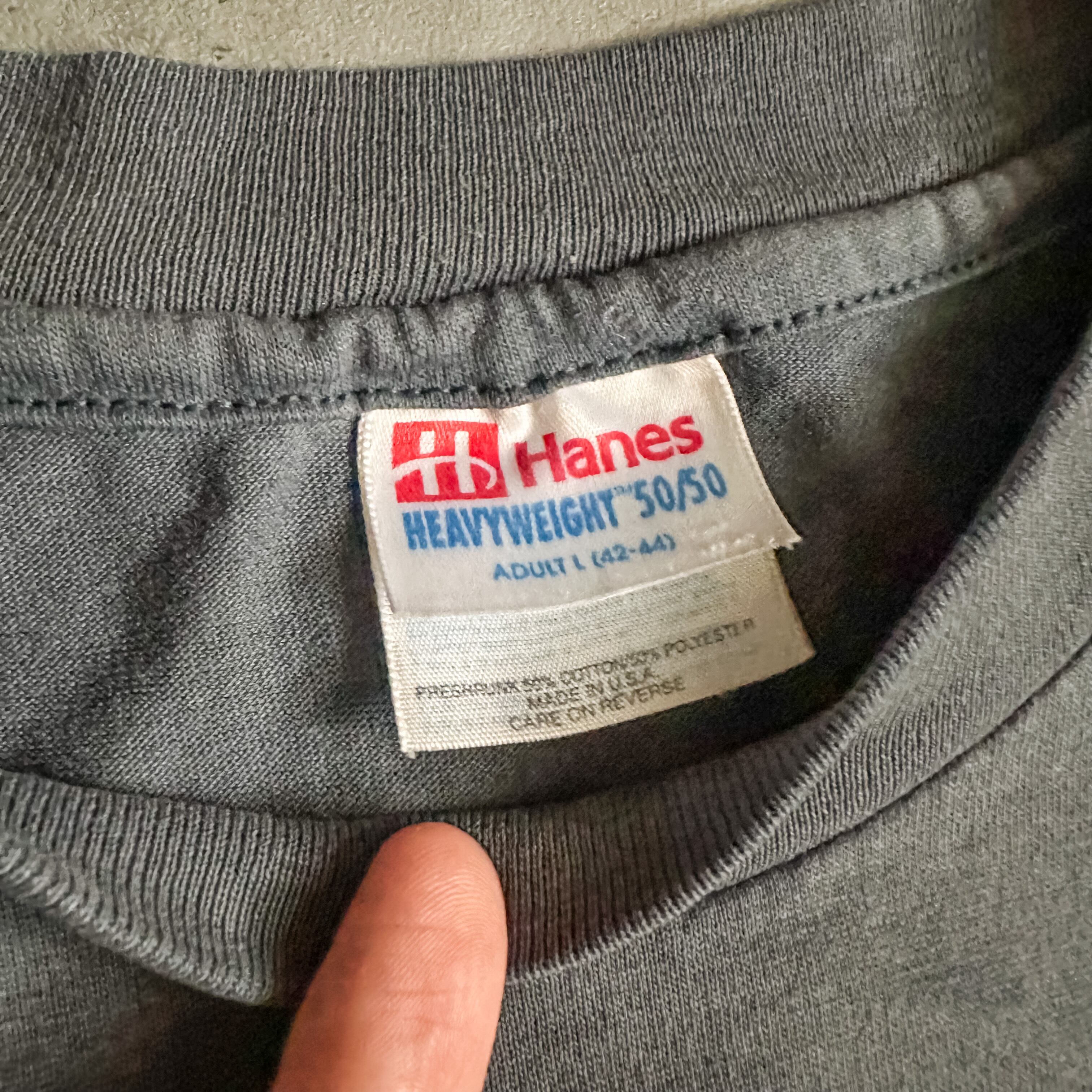 USA製Hanesのコットンポリエステルボディーで、袖裾シングルステッチ。