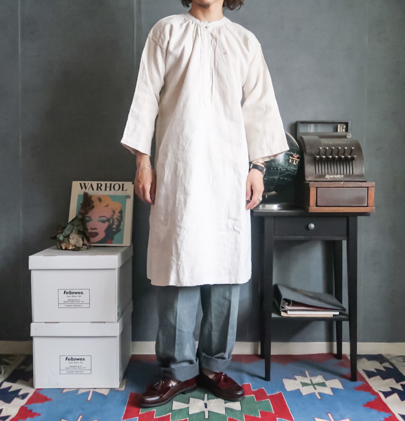 ※※古着故の多少の着用感や画像のように細かな汚れがございます。アンティークなので使用感や薄汚れ等ございますが、目立つダメージはほぼなく、年代を考慮しますとかなりコンディション良好かと思います。裾は切りっぱなしで赤い薄汚れがありますがあまり気にならないかと思います。サイドはスリットでは無く別のリネン生地が使用されています。で古着に理解のない方のご購入はお控えください。