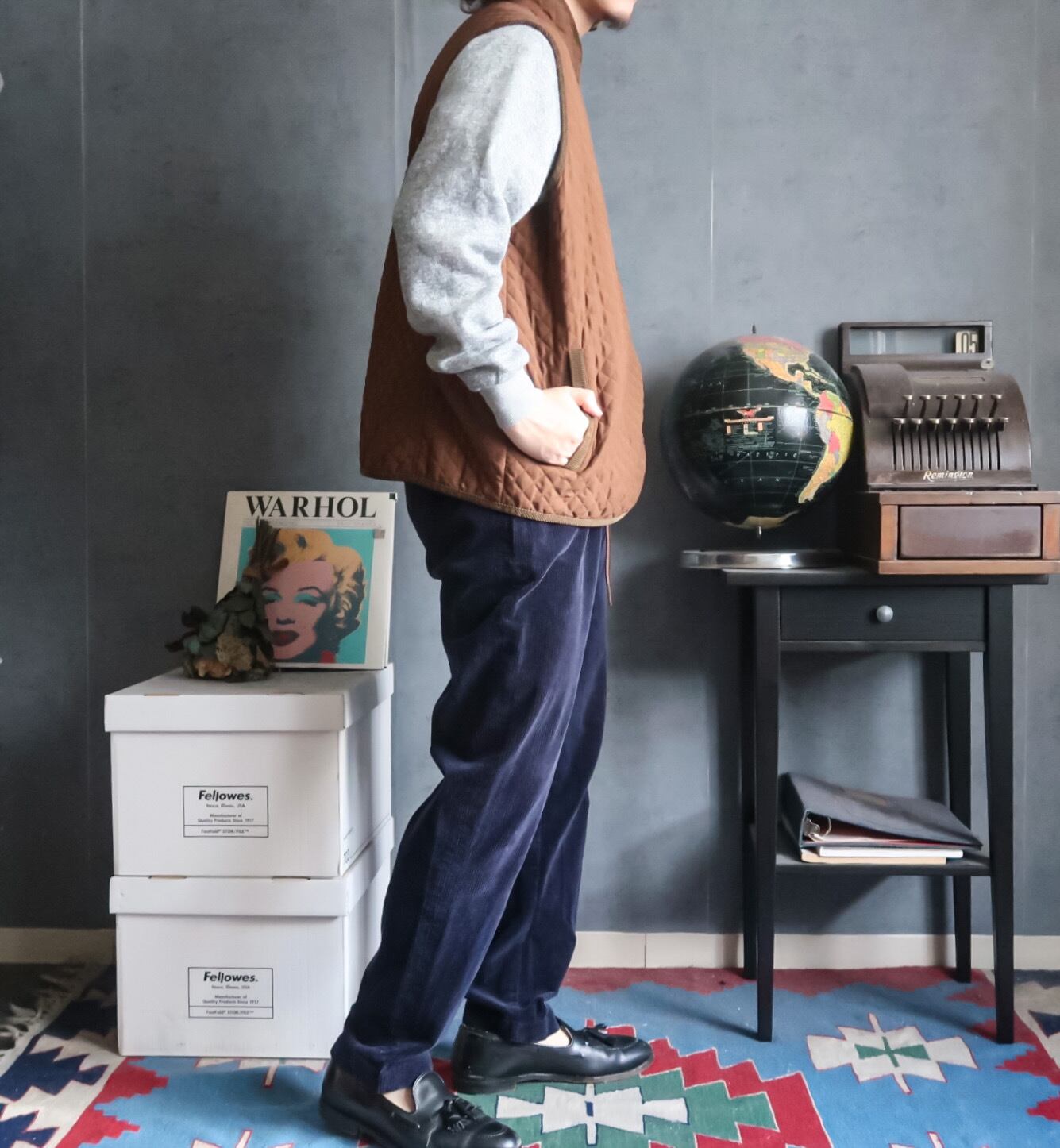 襟周りや裾、ポケットなどがコーデュロイのパイピングで仕立てられたグッドな一着です。