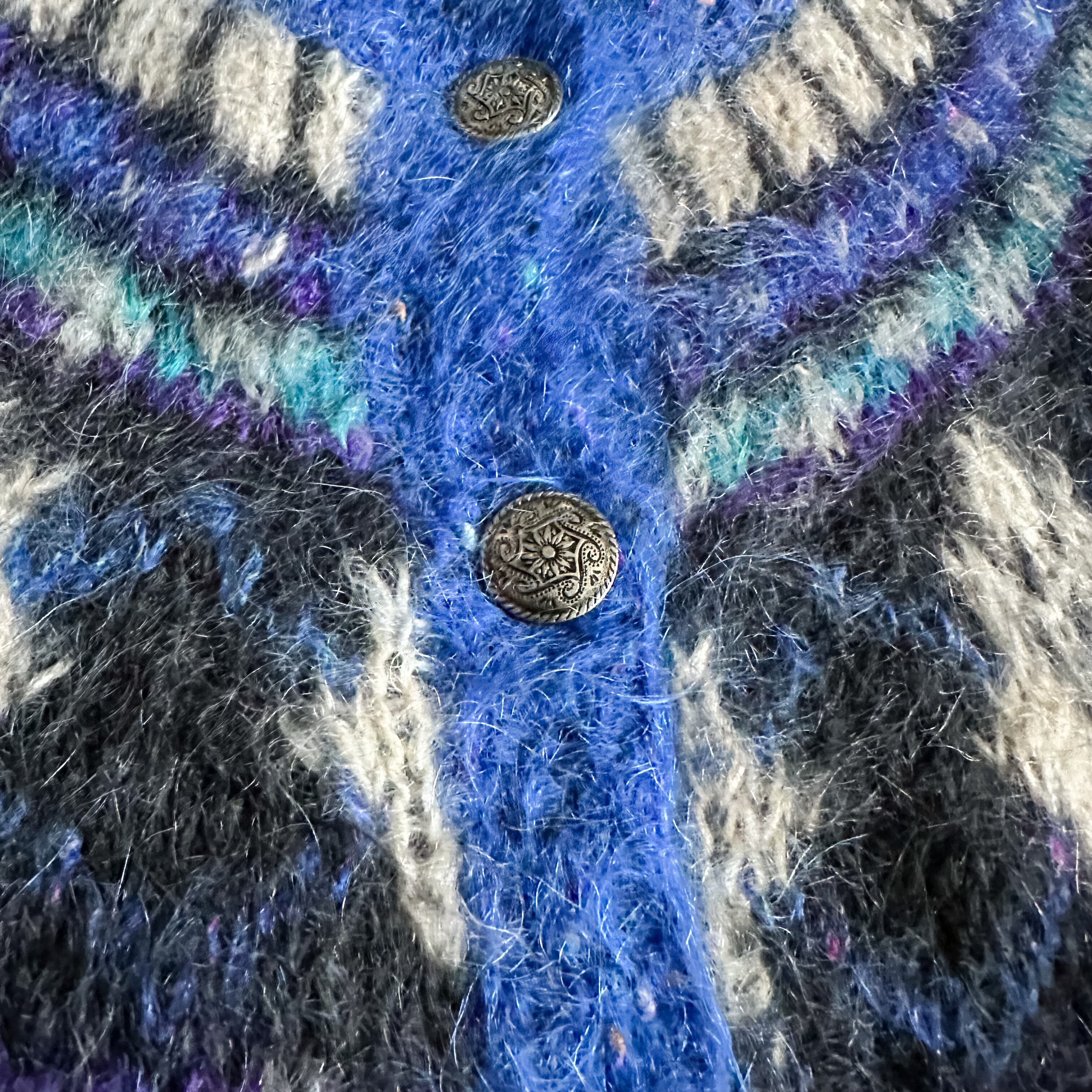 ボタンもコンチョボタンが使用されておりますし、レギュラーの中では最高峰なモヘアカーディガンかと。