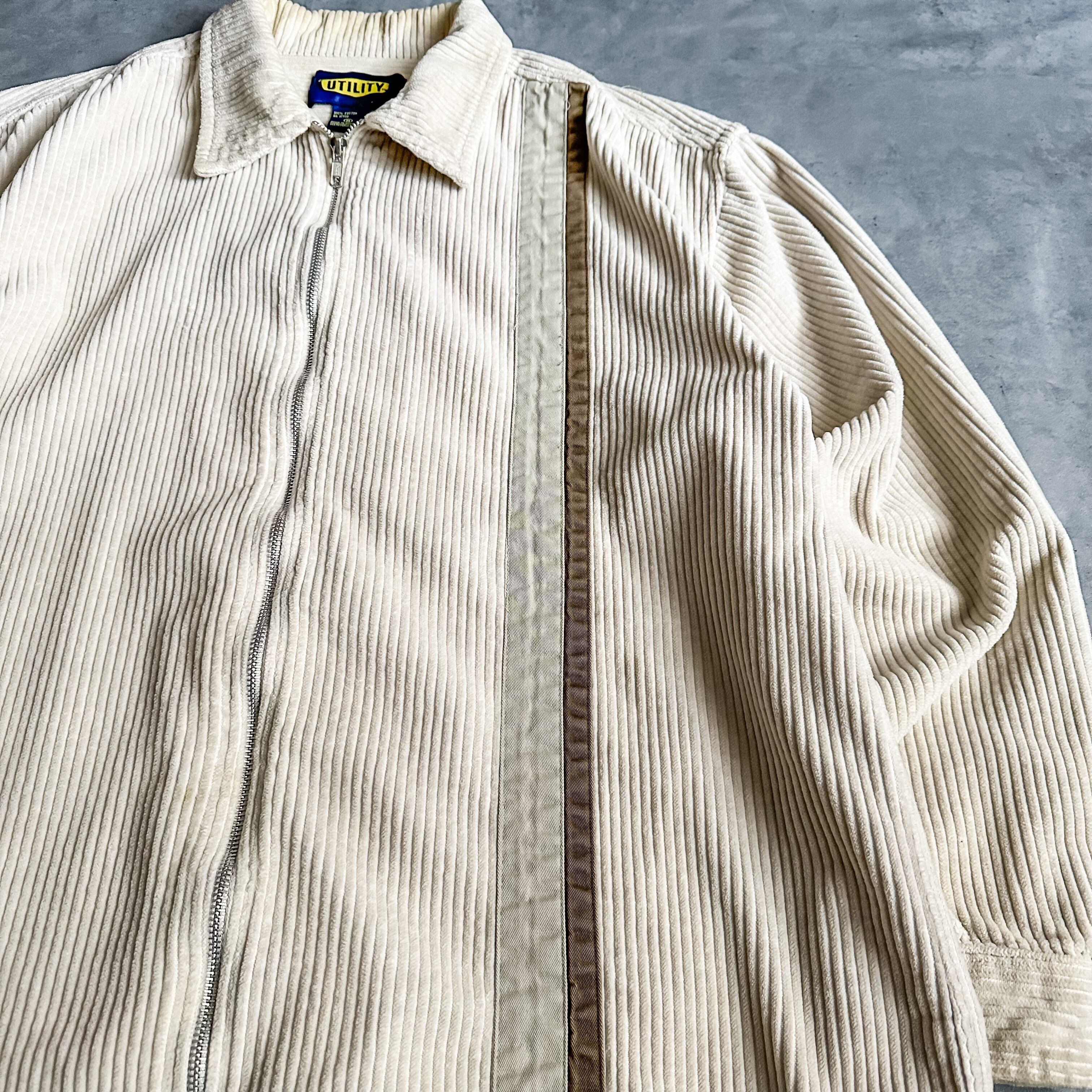 ライトベージュカラーの太畝コーデュロイにフロントはフルジップ、そして左側に2色のラインが入った珍しい仕様です。