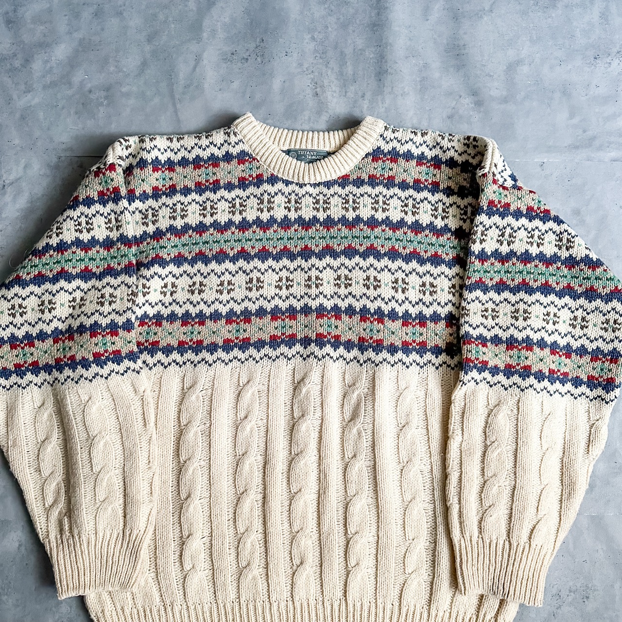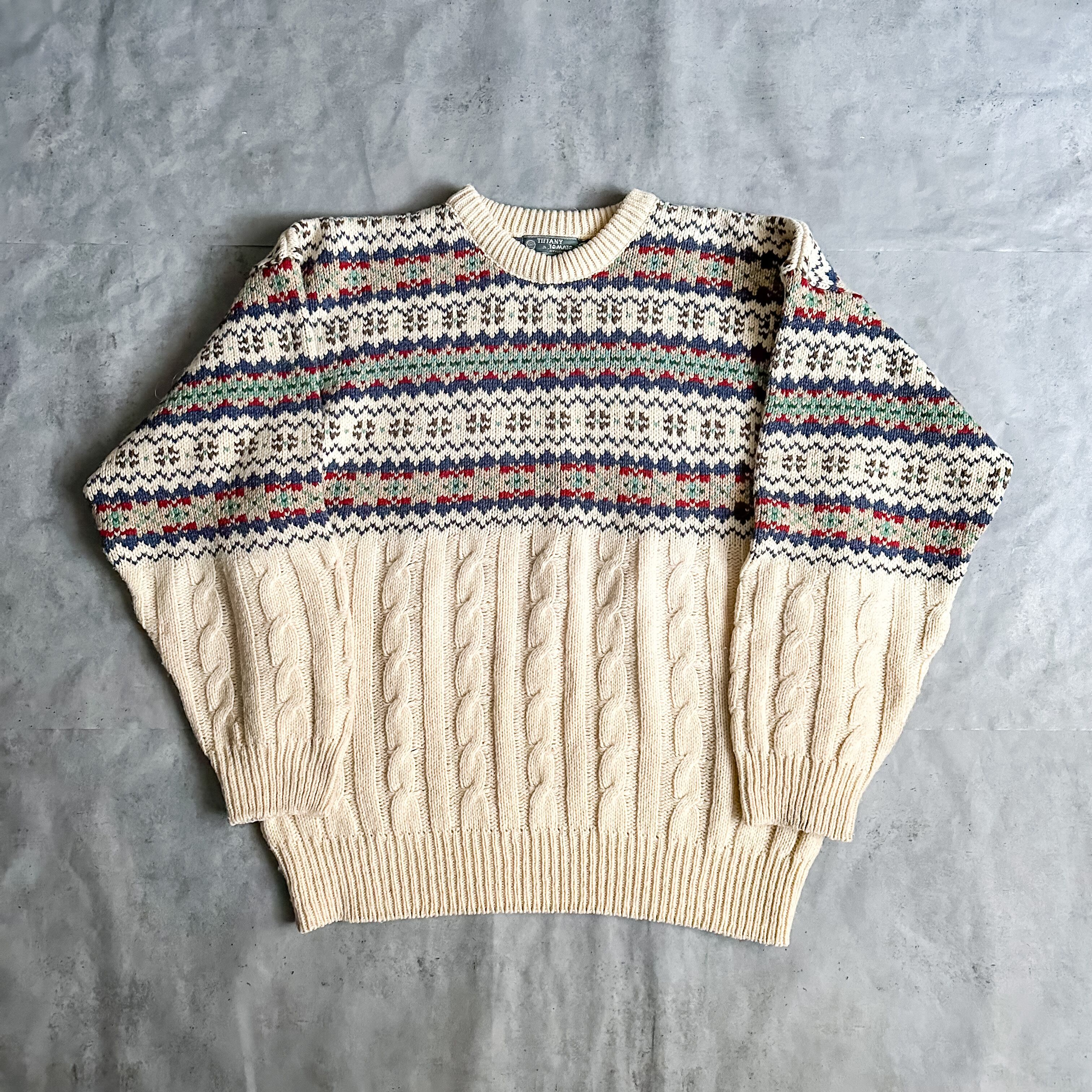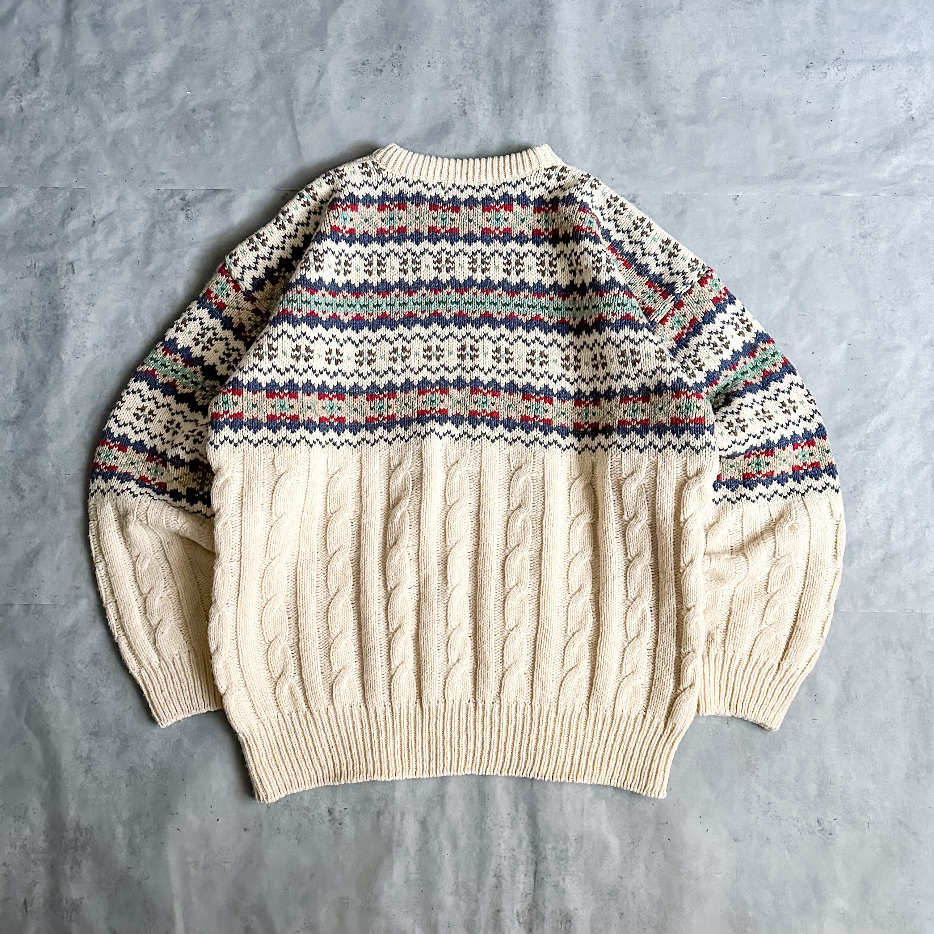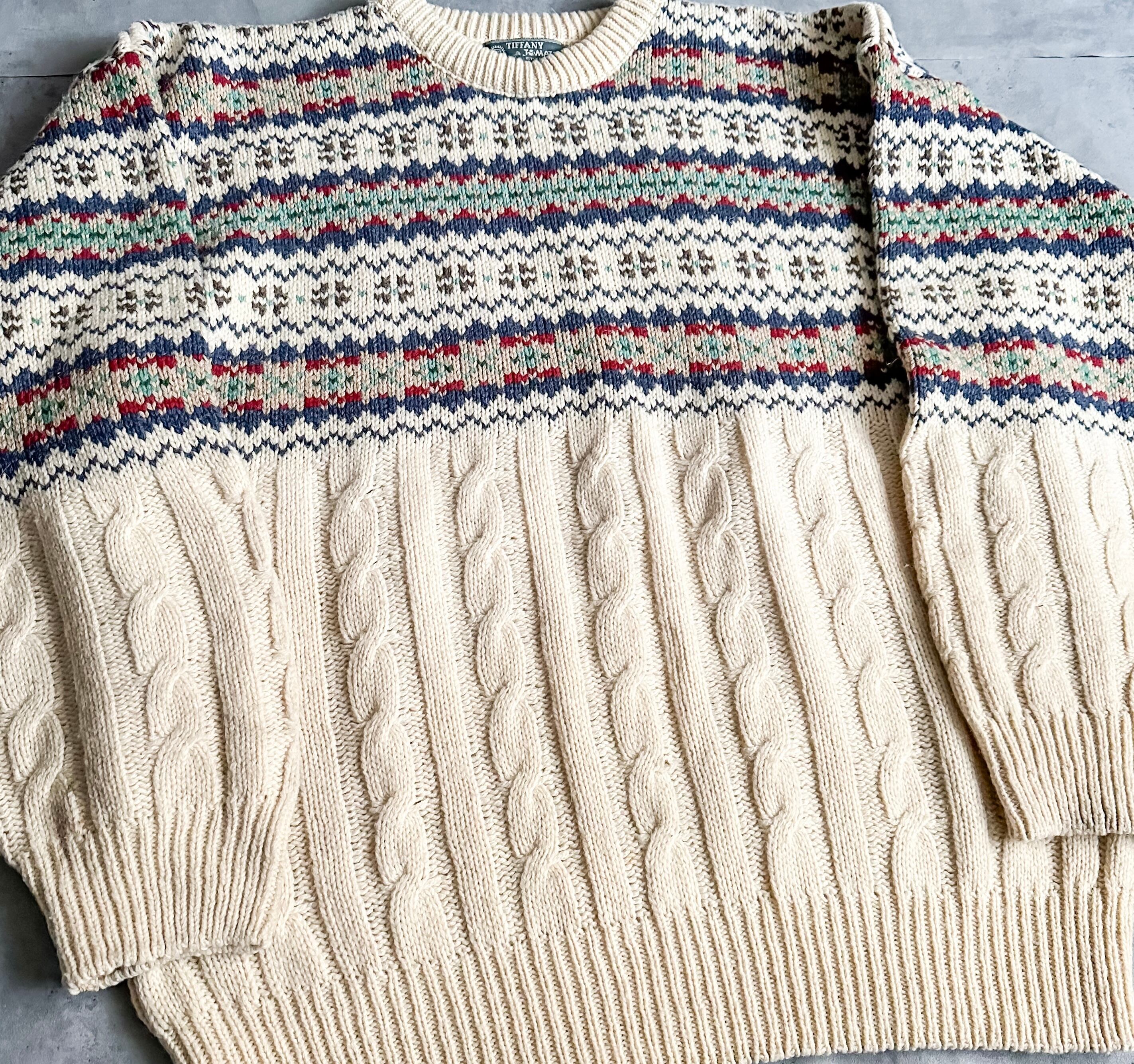 アイボリー系のカラーリングに、胸からアームの半分にかけてはノルディック柄で、下半分はアランニットのようなケーブル編みになった非常に珍しいデザイン。