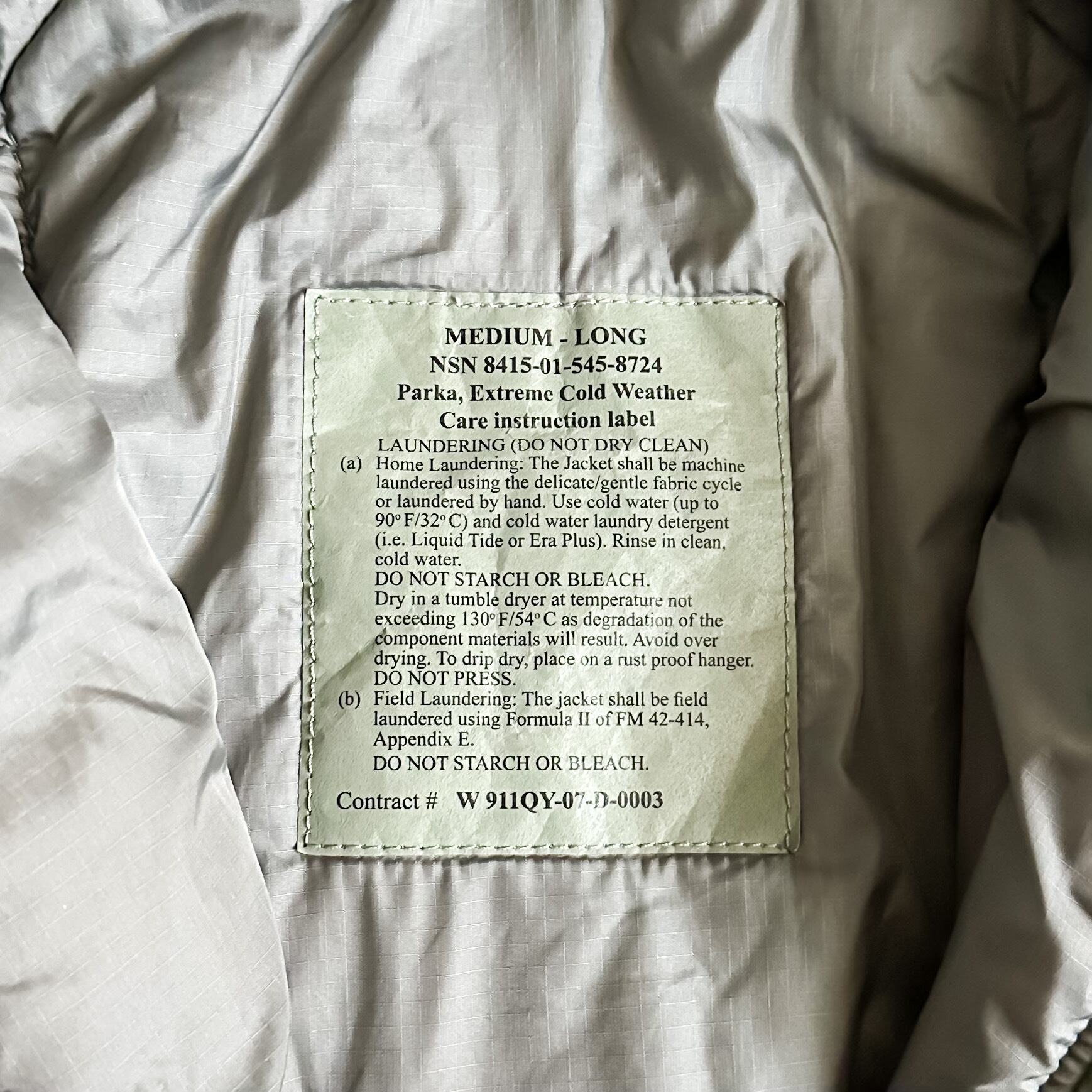 様々な天候、気温に応じて複数のレイヤードパターンレベルで構成されているECWCSですが、こちらはその中でも最高のレベル7に属しており、極寒冷地では規格のレイヤードにより-51,1度の気温にも対応できるように開発された最終防寒アウターです。