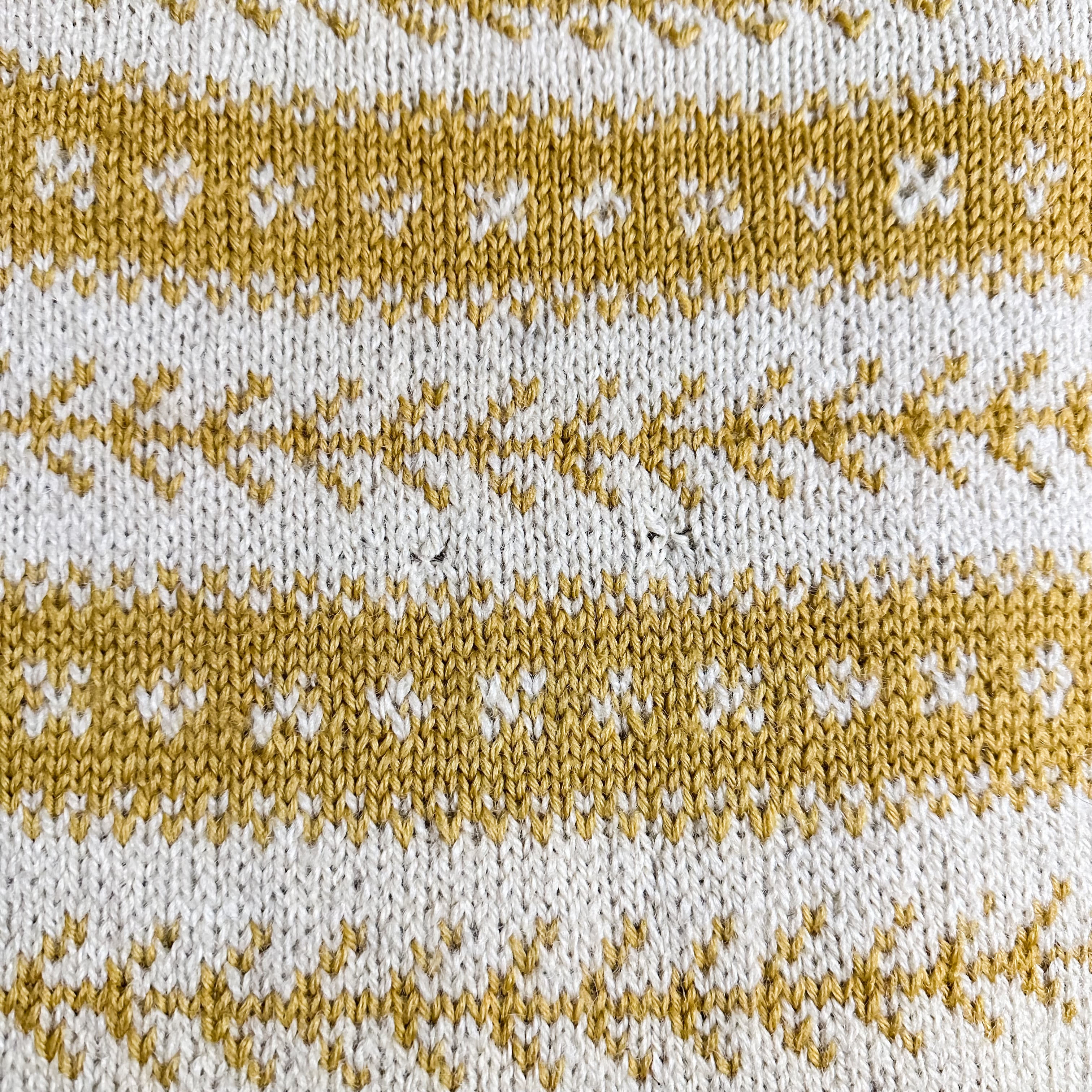 マスタード×アイボリー系の珍しいカラーリングに、ノルディックのような柄がグッドな一着です。