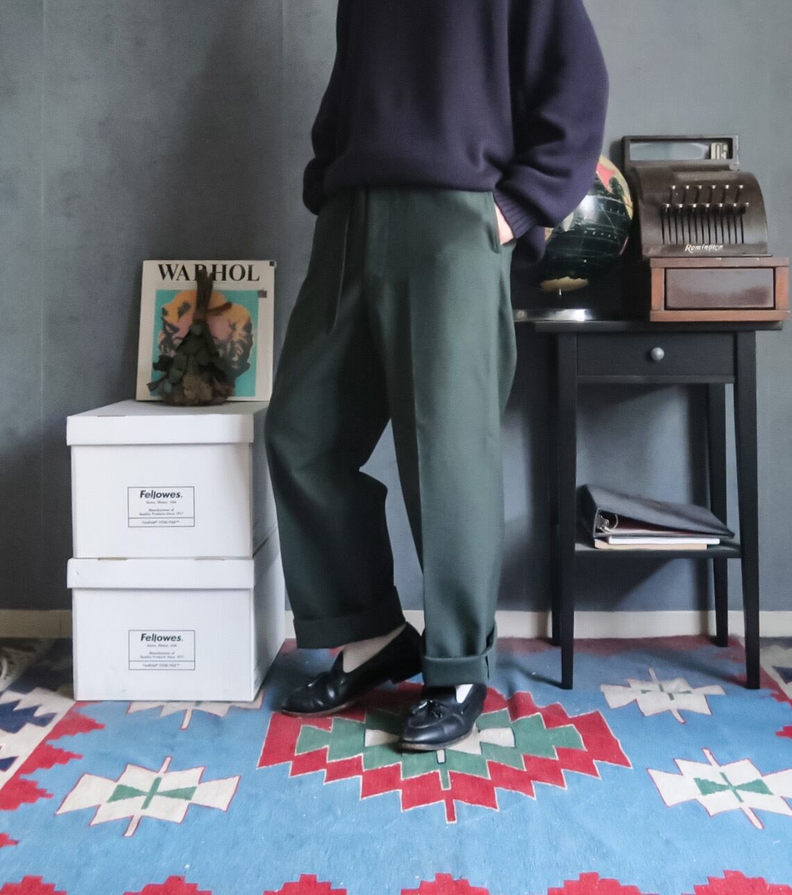深いオリーブグリーンに少しグレーが混ざったような独特なserge greenカラーが良いですね。