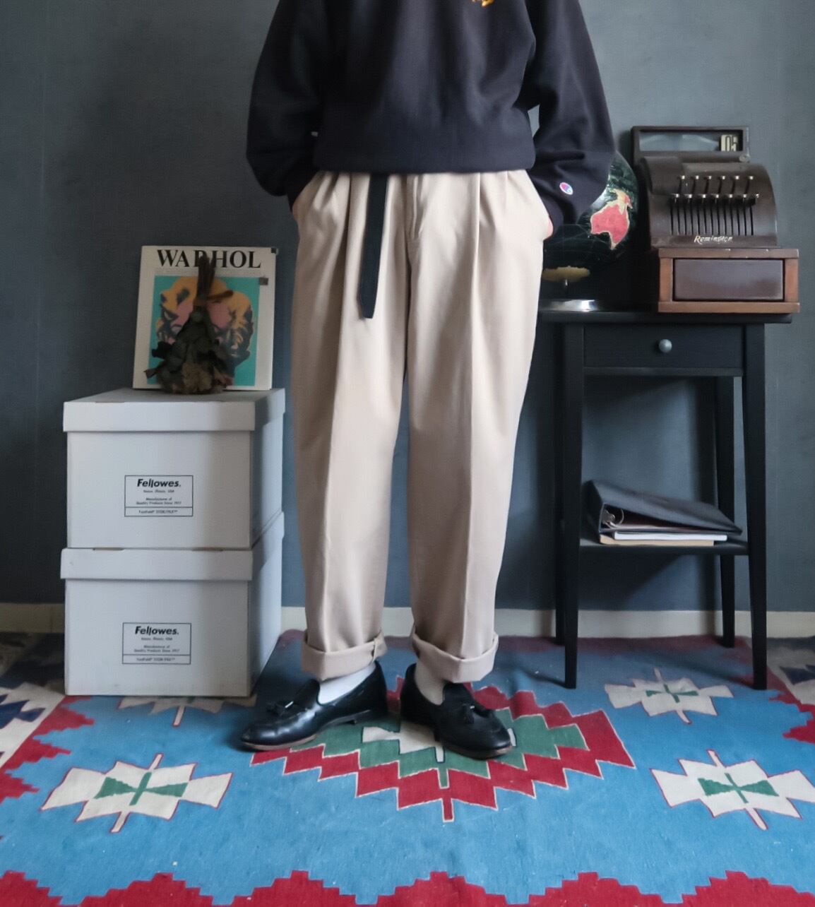 HAMMOND PANTは2タックの腰回りとダブル仕上げの裾、無骨なシルエットが魅力のスタンダードな仕様で、通常よりもライトな肌触りの良いコットン生地で仕立てられた一本。