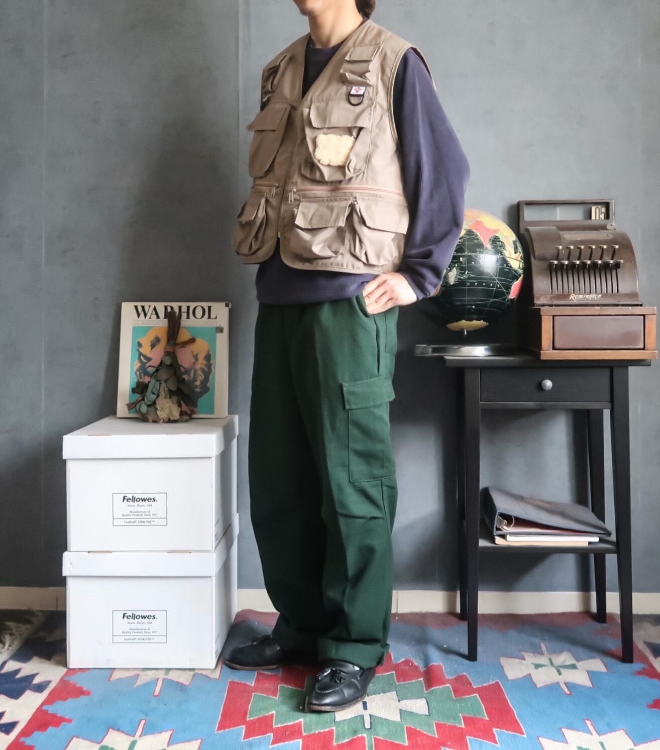 フィッシングベストと言うこともありフロント、バック共に多数のポケットやジップが付くなど、ギミック感が素晴らしいディテールの面白い一着。