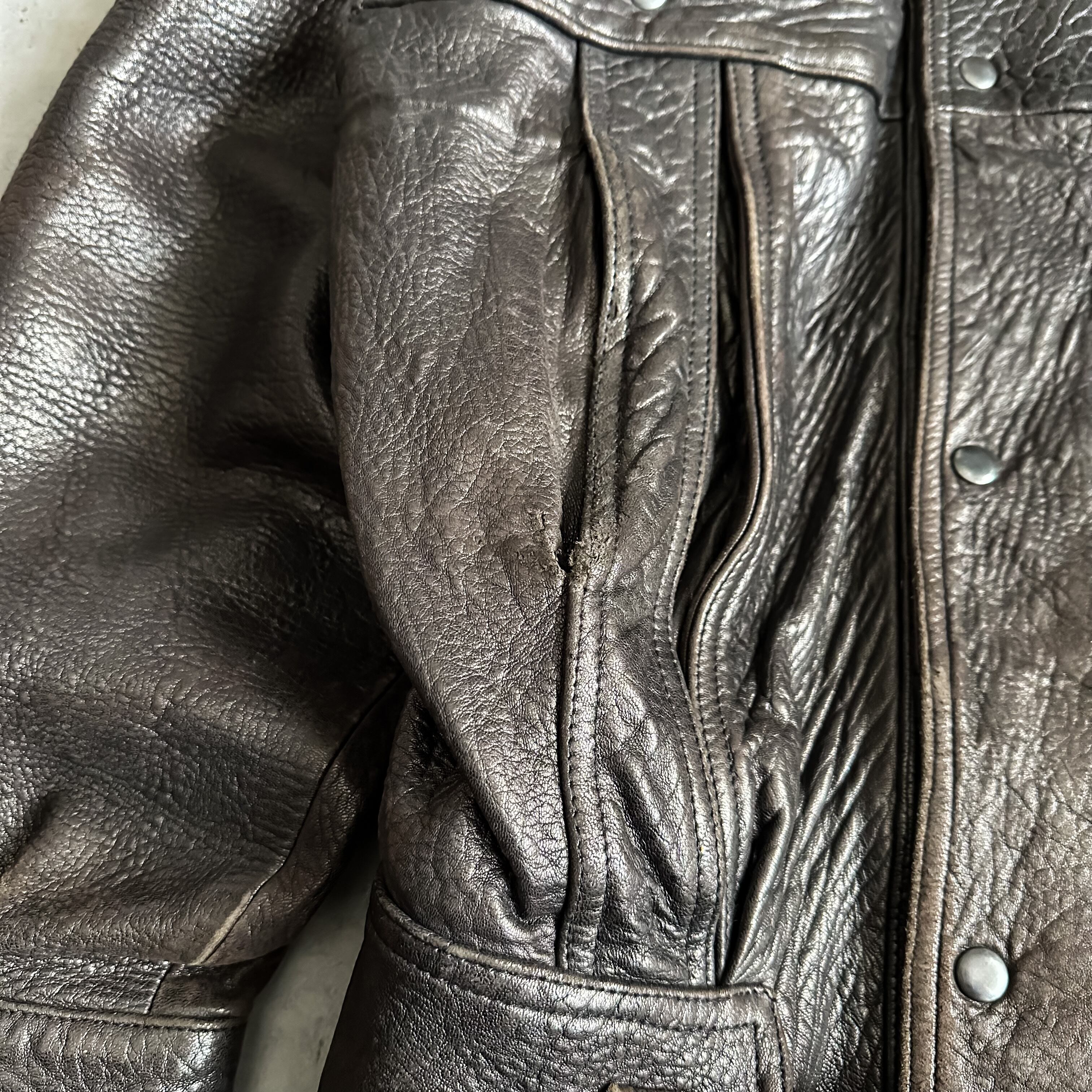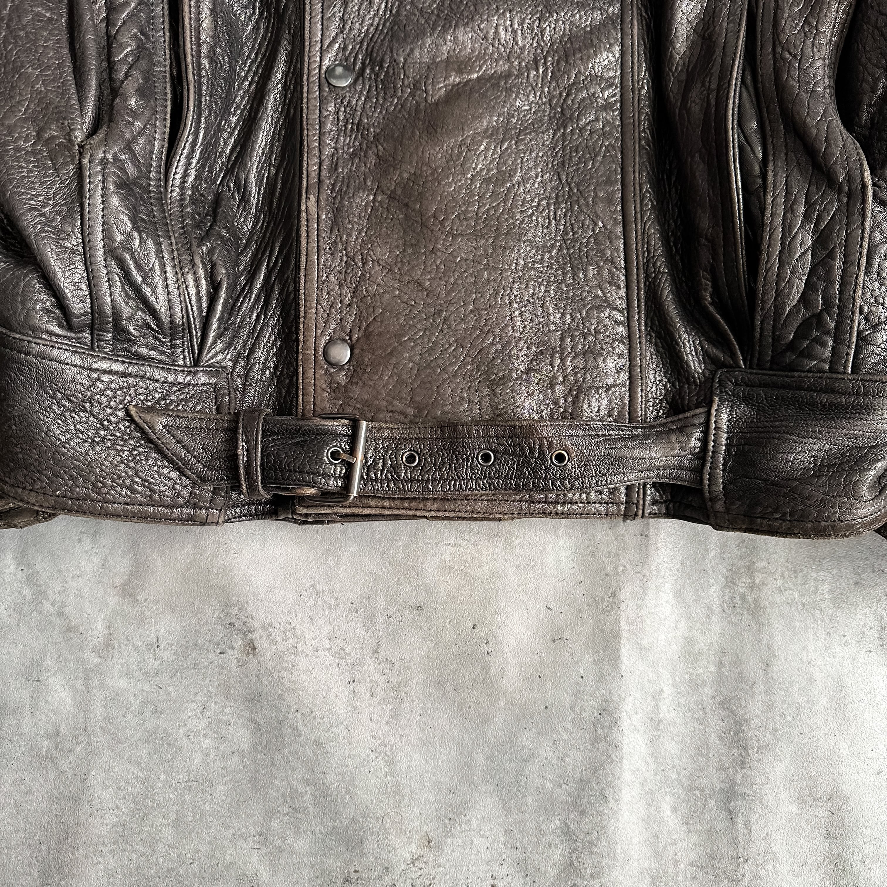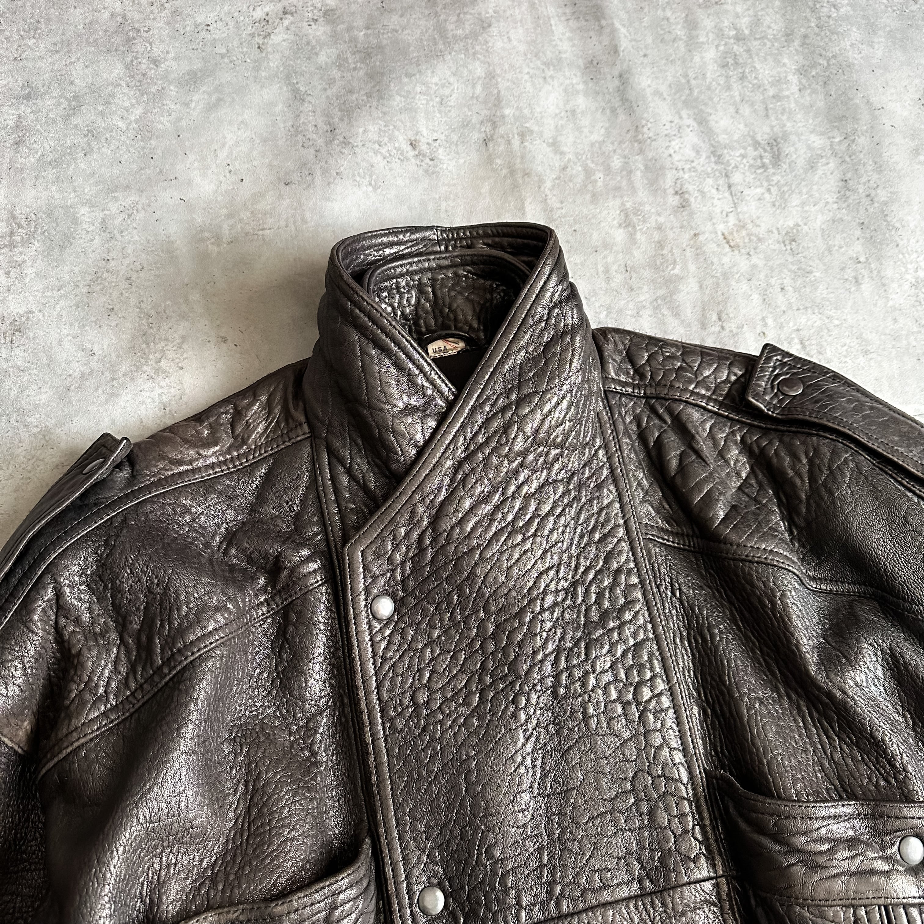 もちもちとした柔らかな質感のレザーに、この年代ならではな唯一無二な変形デザインがクールな一着です。