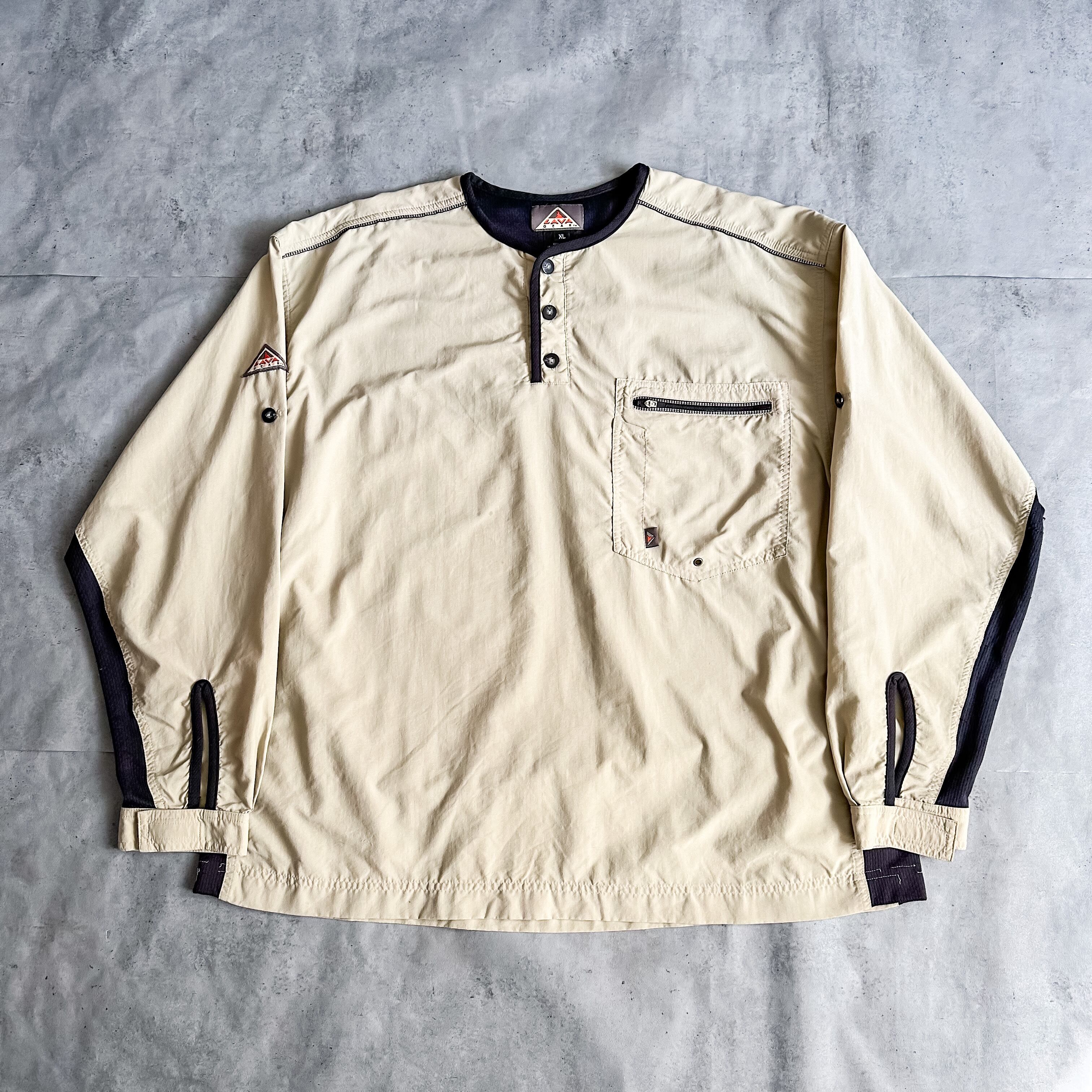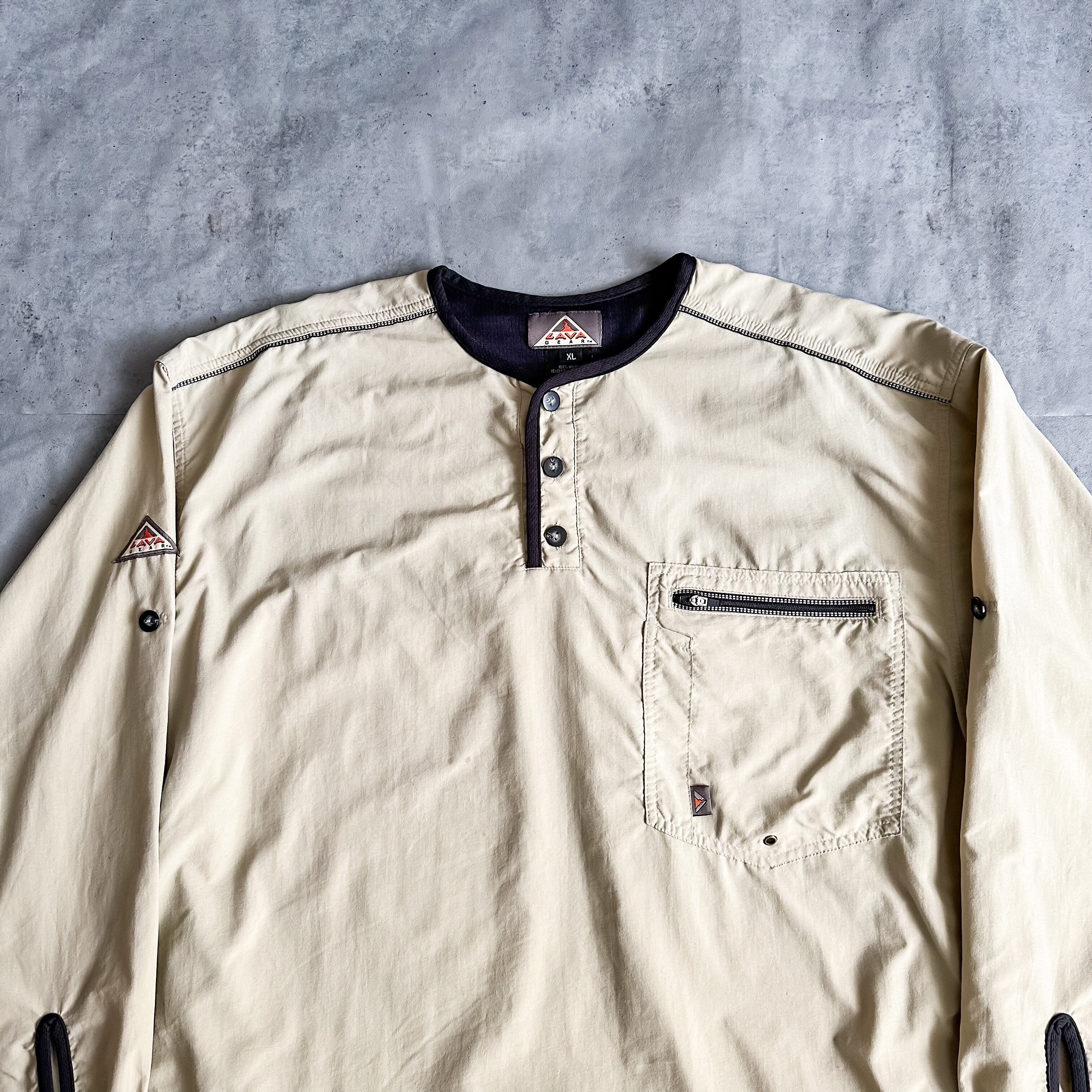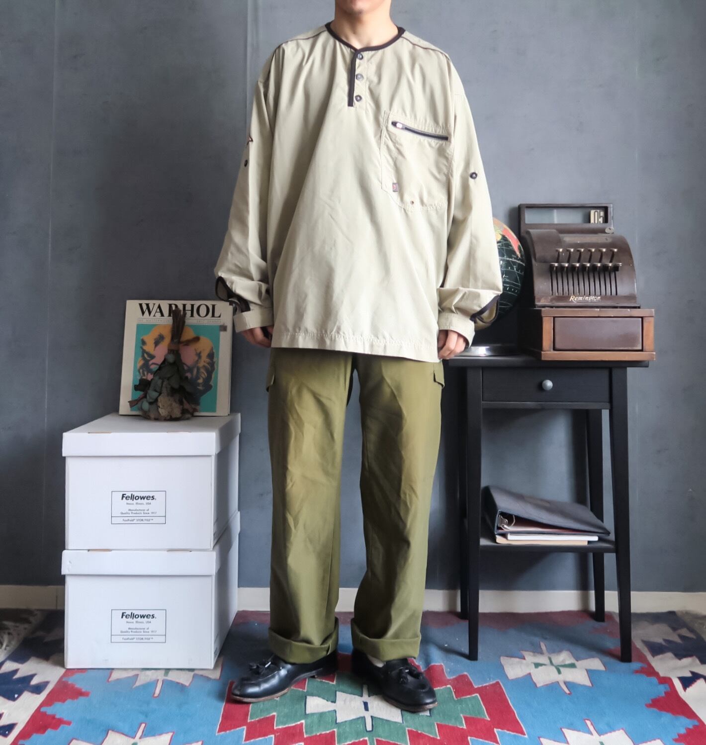 少しベージュがかったアイボリー系のカラーリングに、フィッシングシャツでは珍しいヘンリーネック仕様のこなれた印象の一着です。