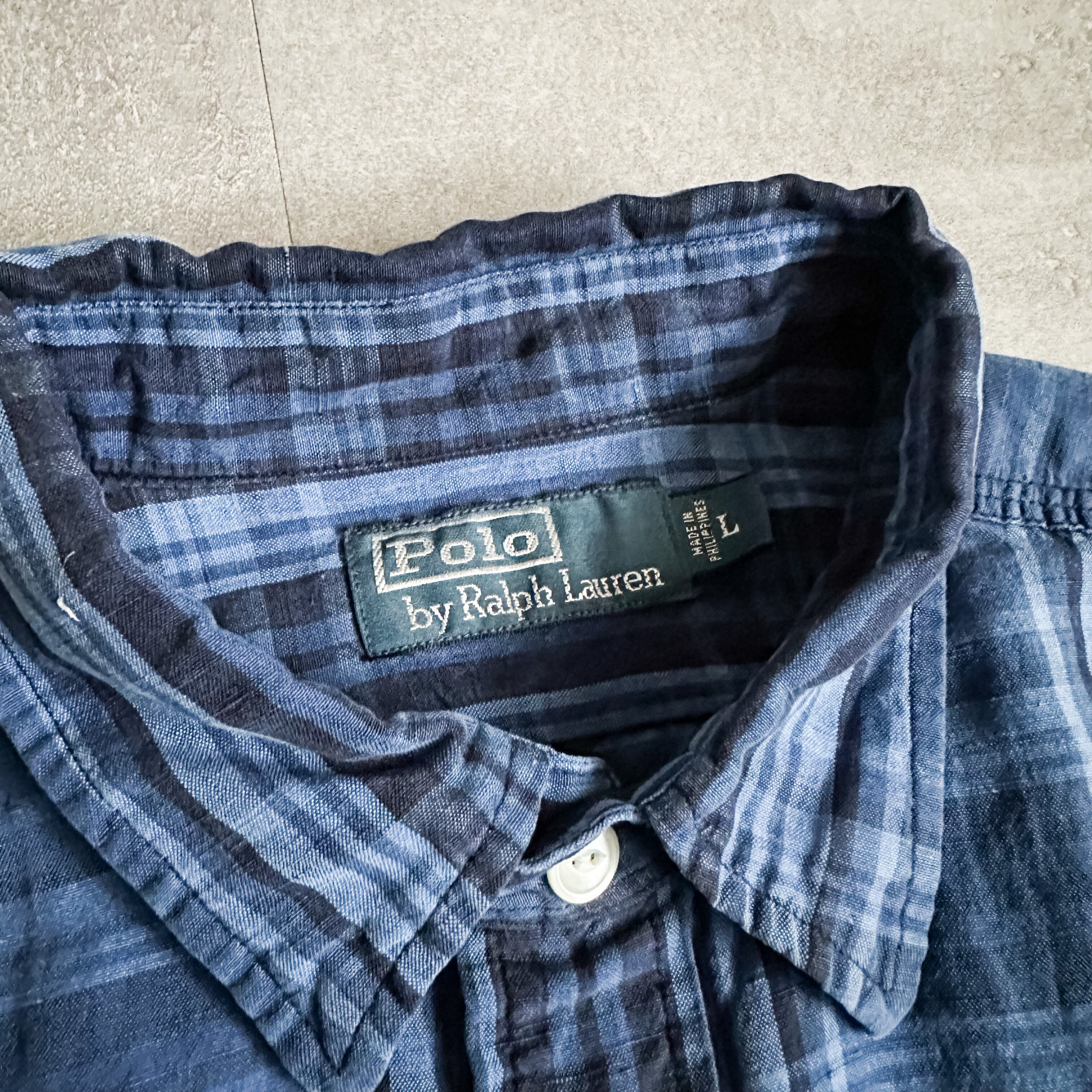 1990's "Polo Ralph Lauren" plaid pattern silk×linen shirt with chinstrap