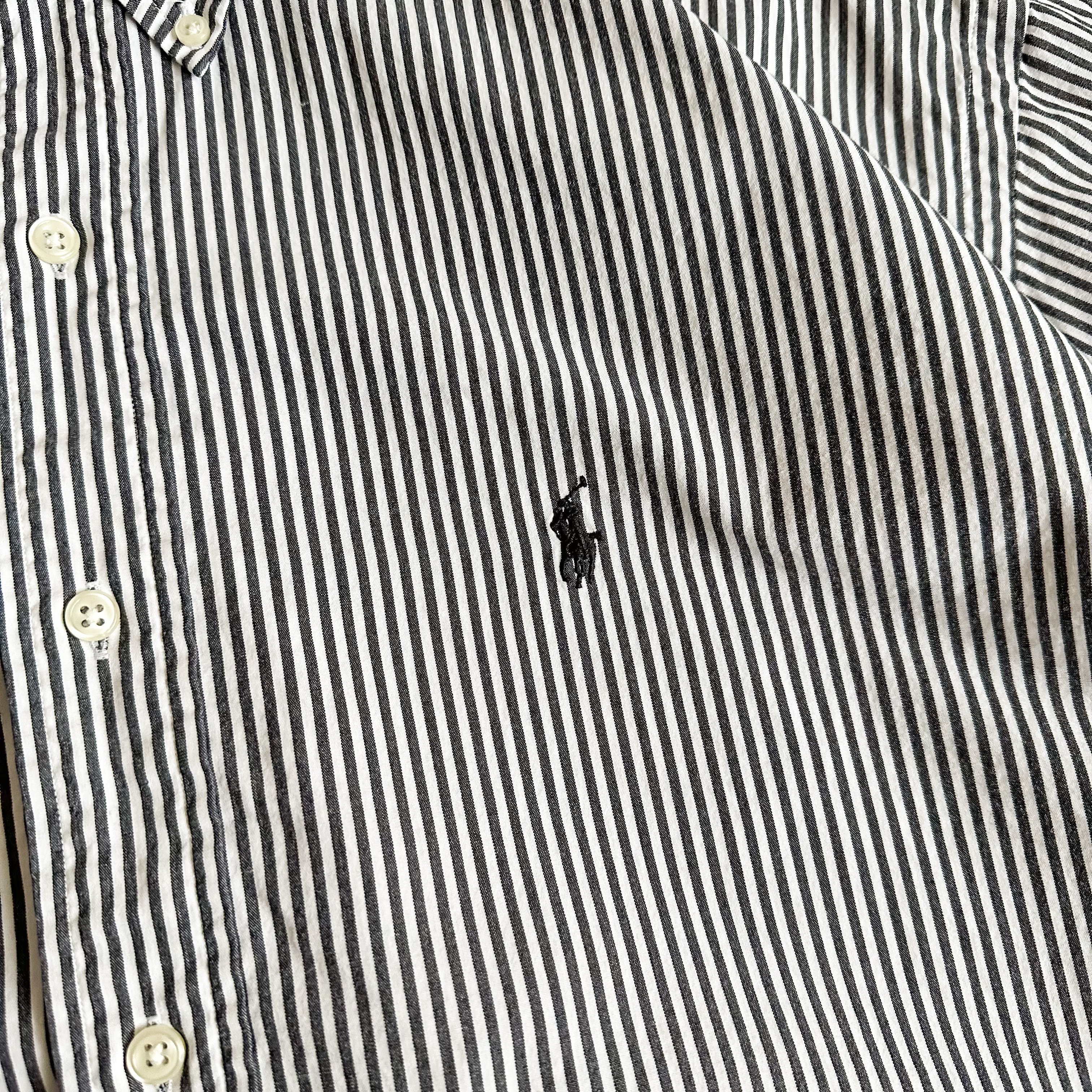 ストライプの中でも大人な雰囲気のあるブラック×ホワイトのモノトーンのストライプに、ボタンダウンで胸にはポニーのワンポイント刺繍。
