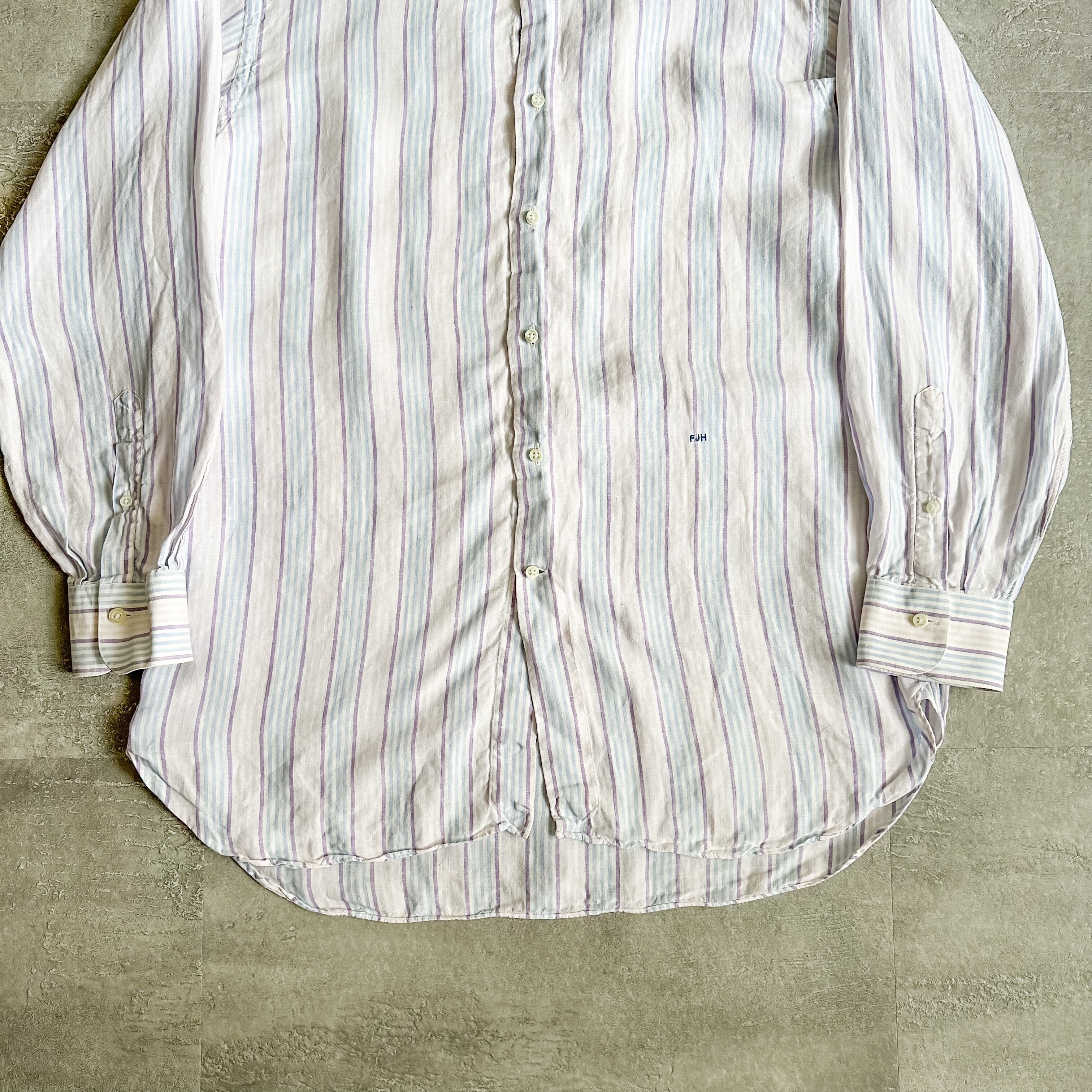1990's~ "Ermenegildo Zegna" stripe pattern linen cotton band collar shirt made in Spain
