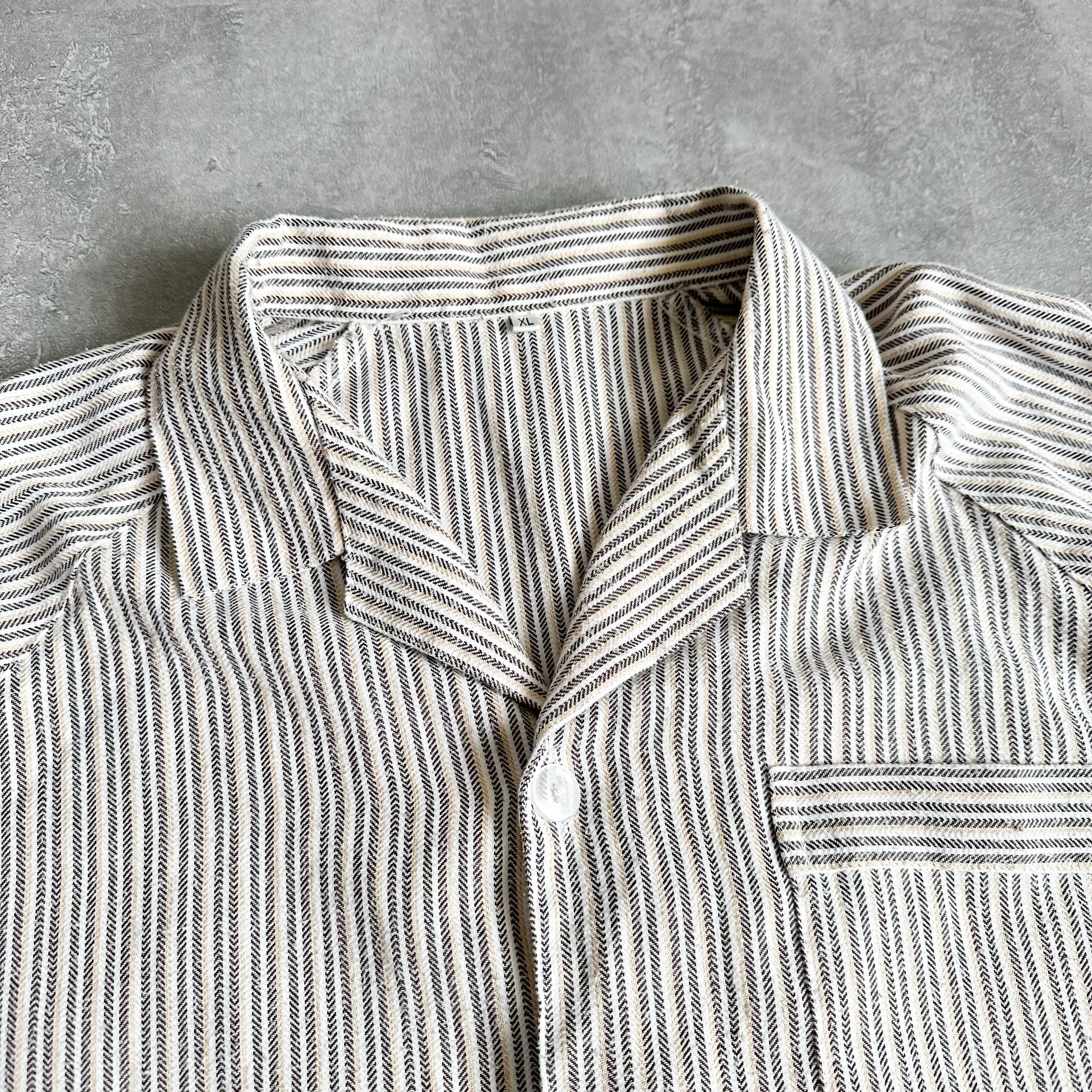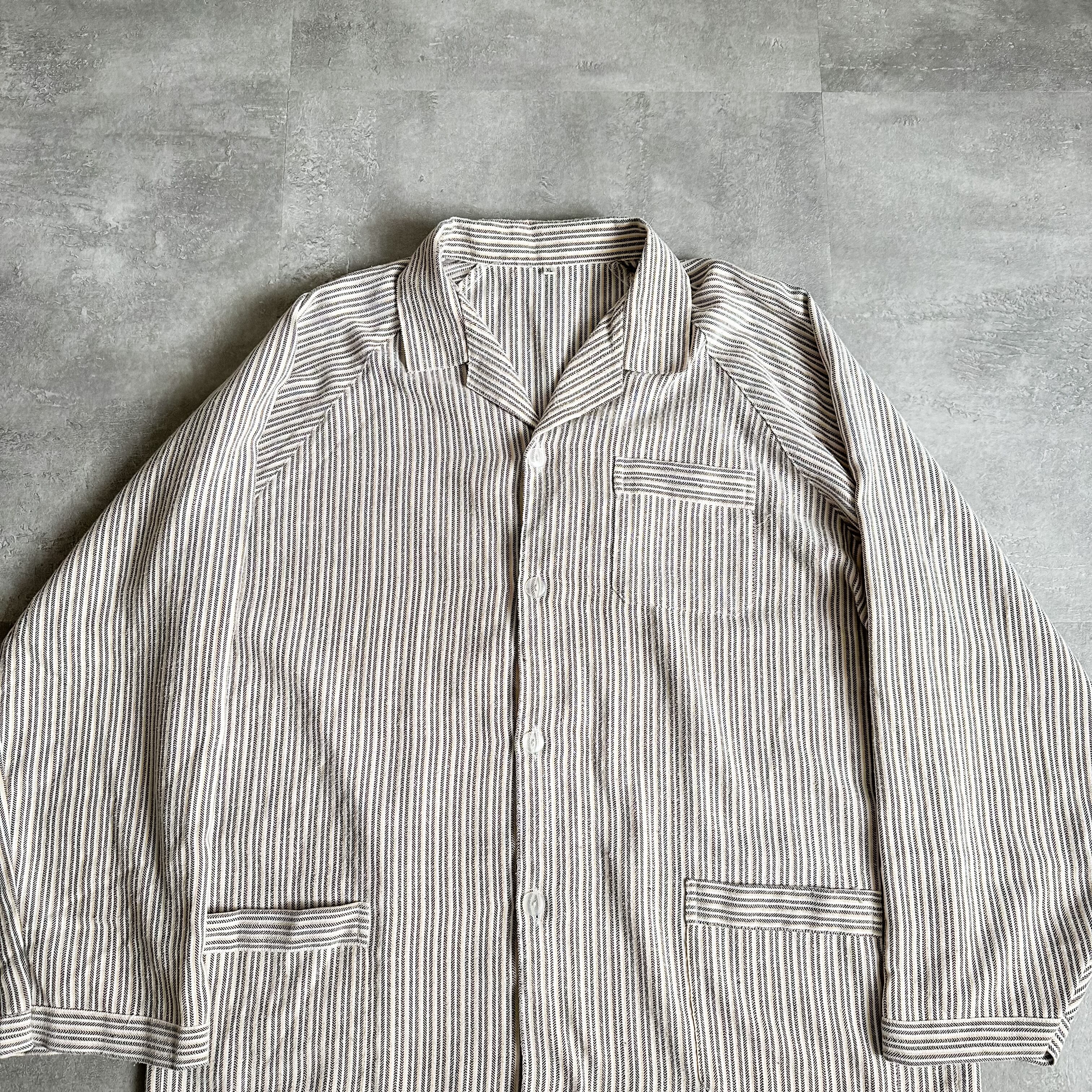ヘリンボーン織りの素晴らしいストライプ柄に、旬なオープンカラーと三つポケのカバーオールのようなデザイン。