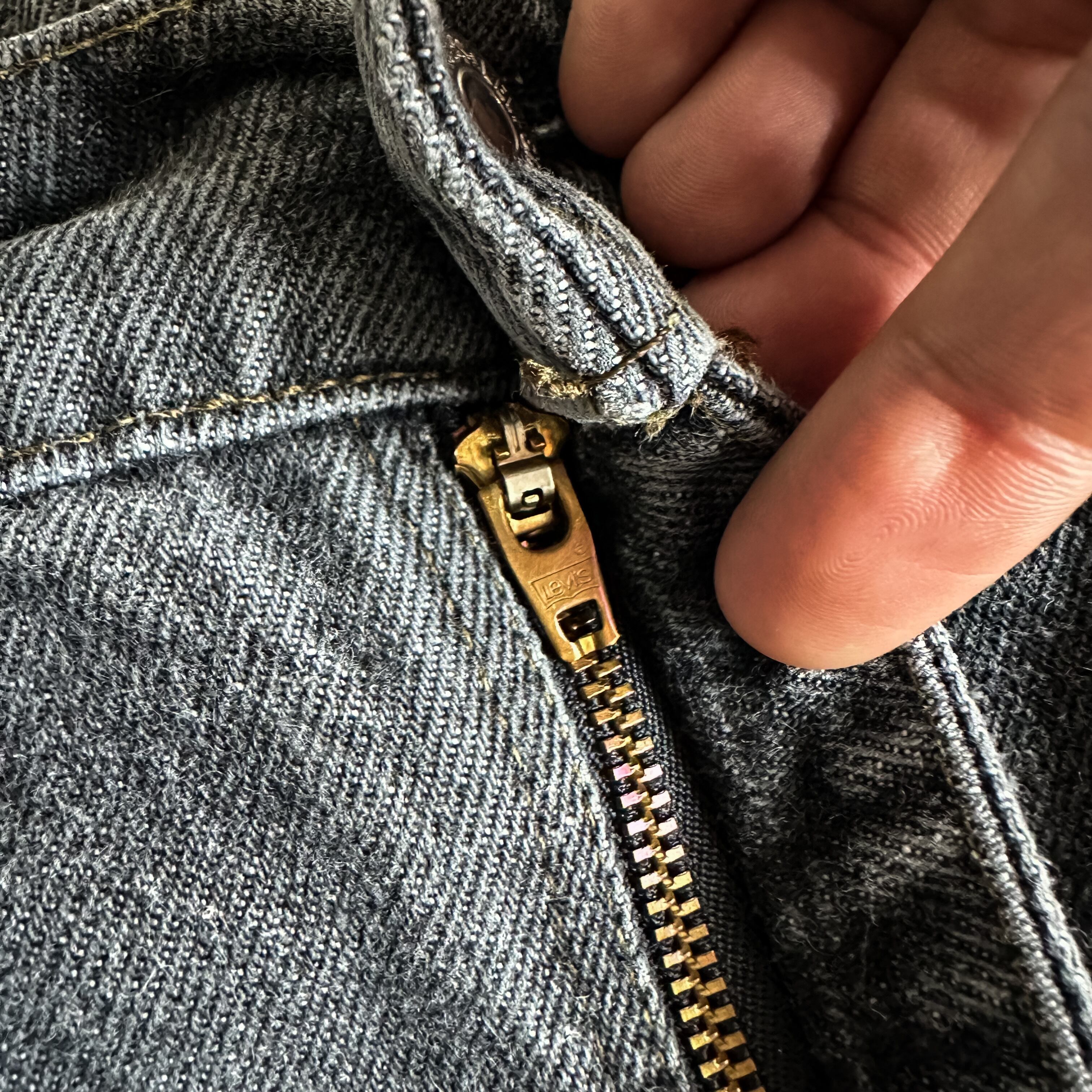 先染めブラックは経年と共に表糸と裏糸の表情が現れキレイにフェードしたグレーへと色落ちしていきます。