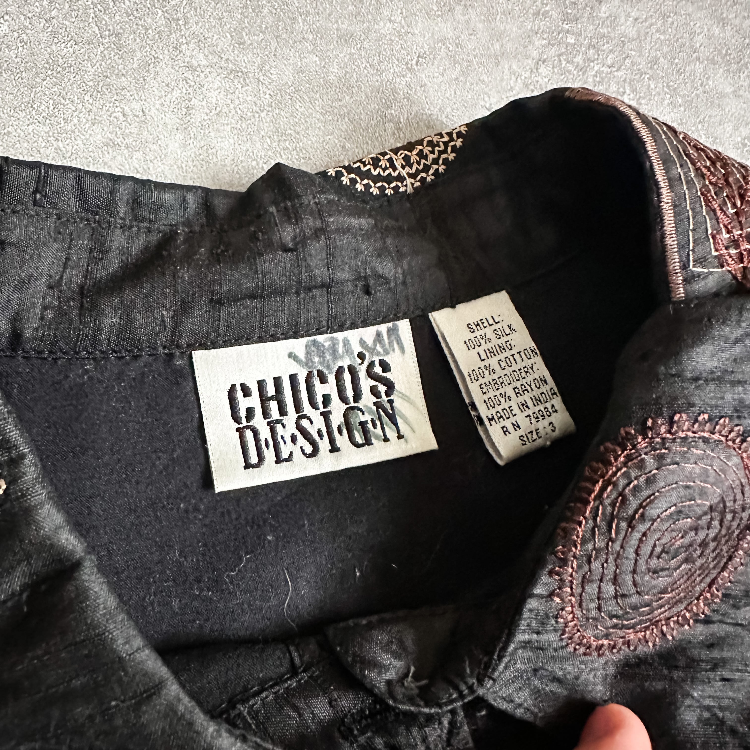 デニムの刺繍ジャケットはよく見ますが、珍しいブラックのシルクというところもポイントでしょう。