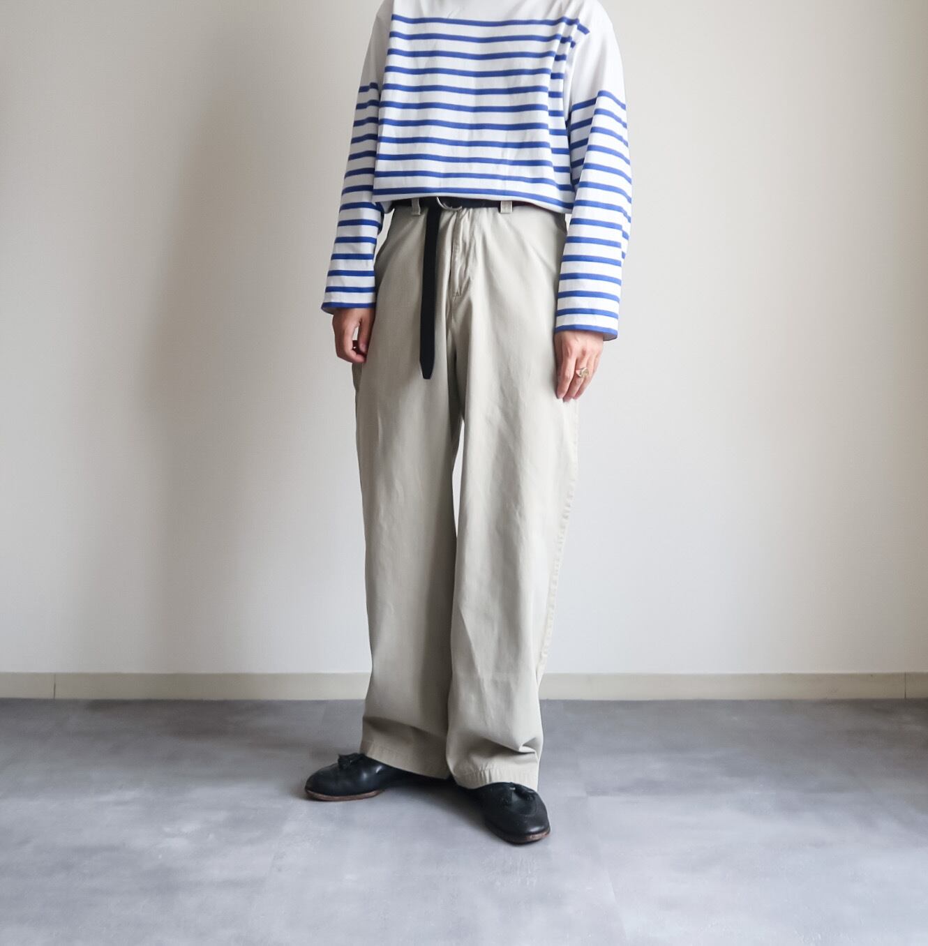 ハリのあるオールコットン素材に、どっしりと落ちた太めのワイドシルエットがグッドな一本です。