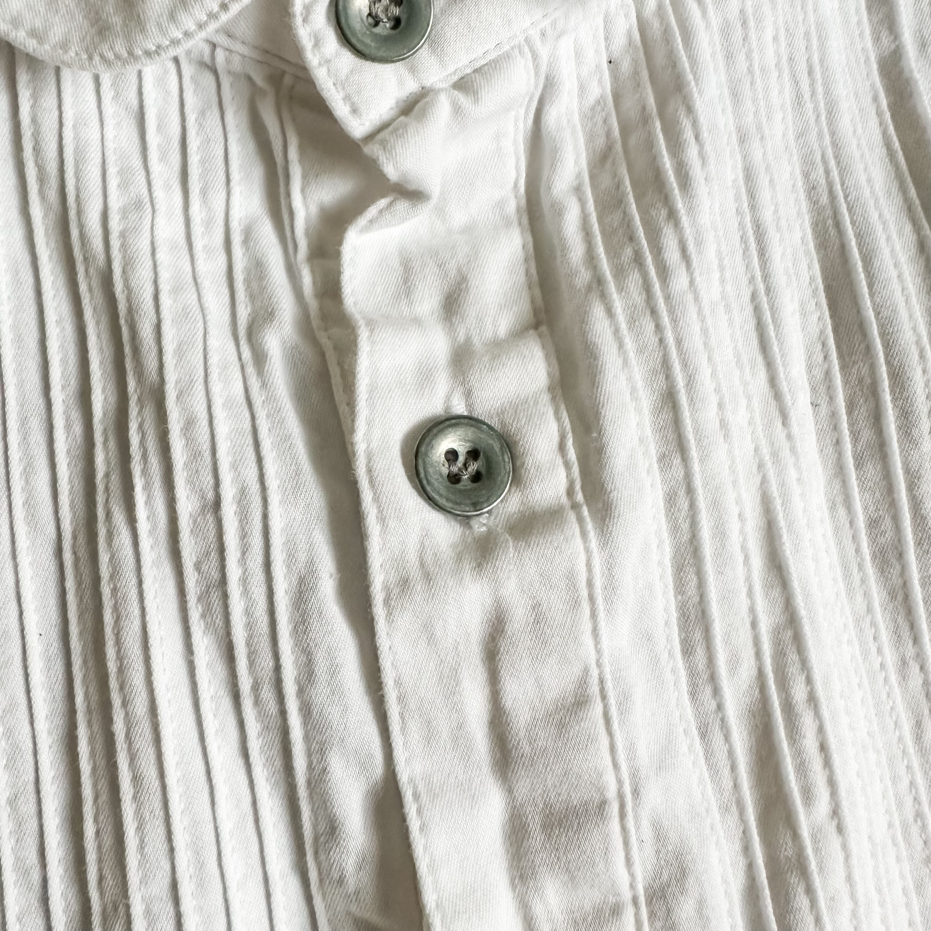 可愛らしい丸襟にフロントにプリーツの入ったドレスシャツスタイル。