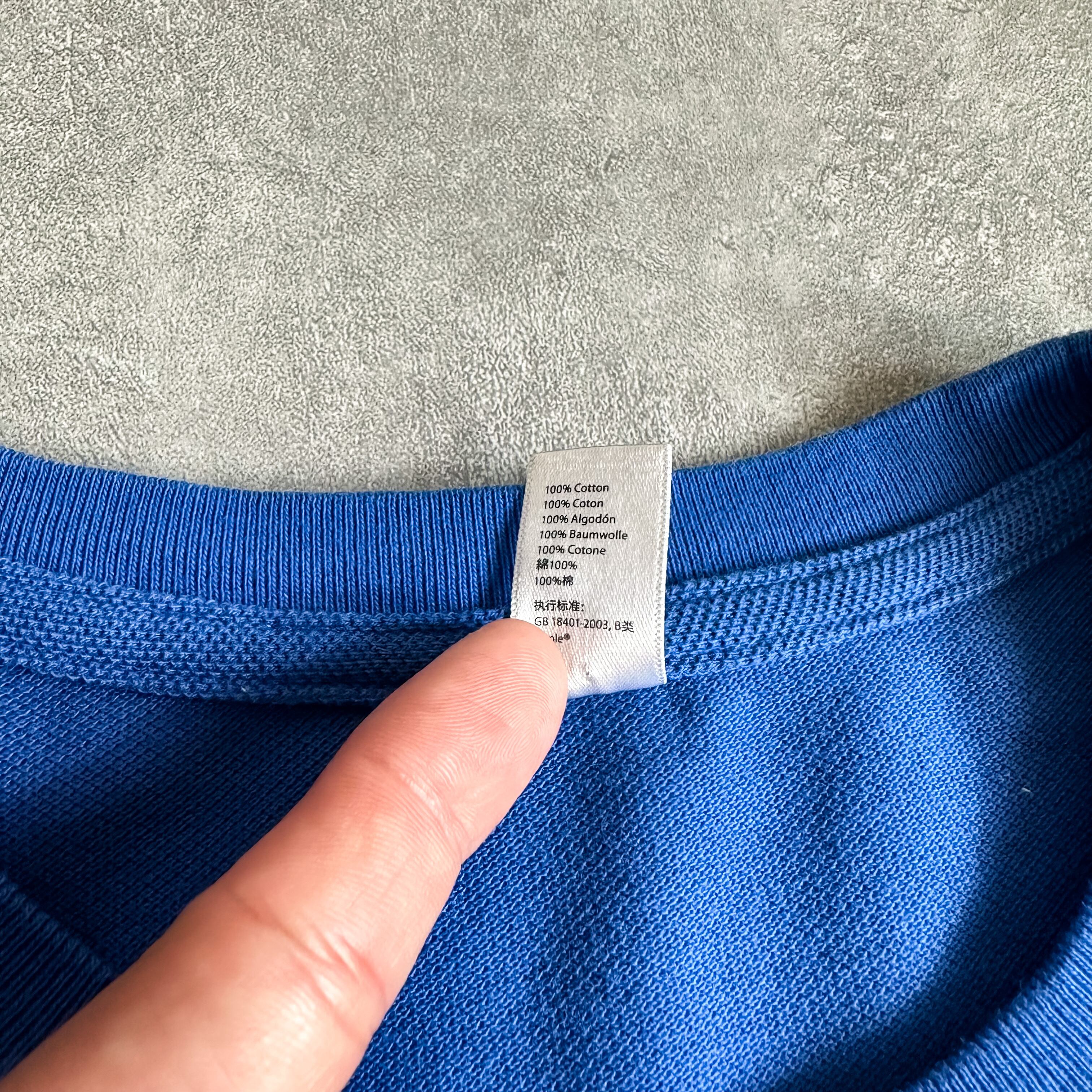 目を引くブルー系のカラーリングに、りんごのロゴのワッペンが付くappleの中でも見かけない一枚です。