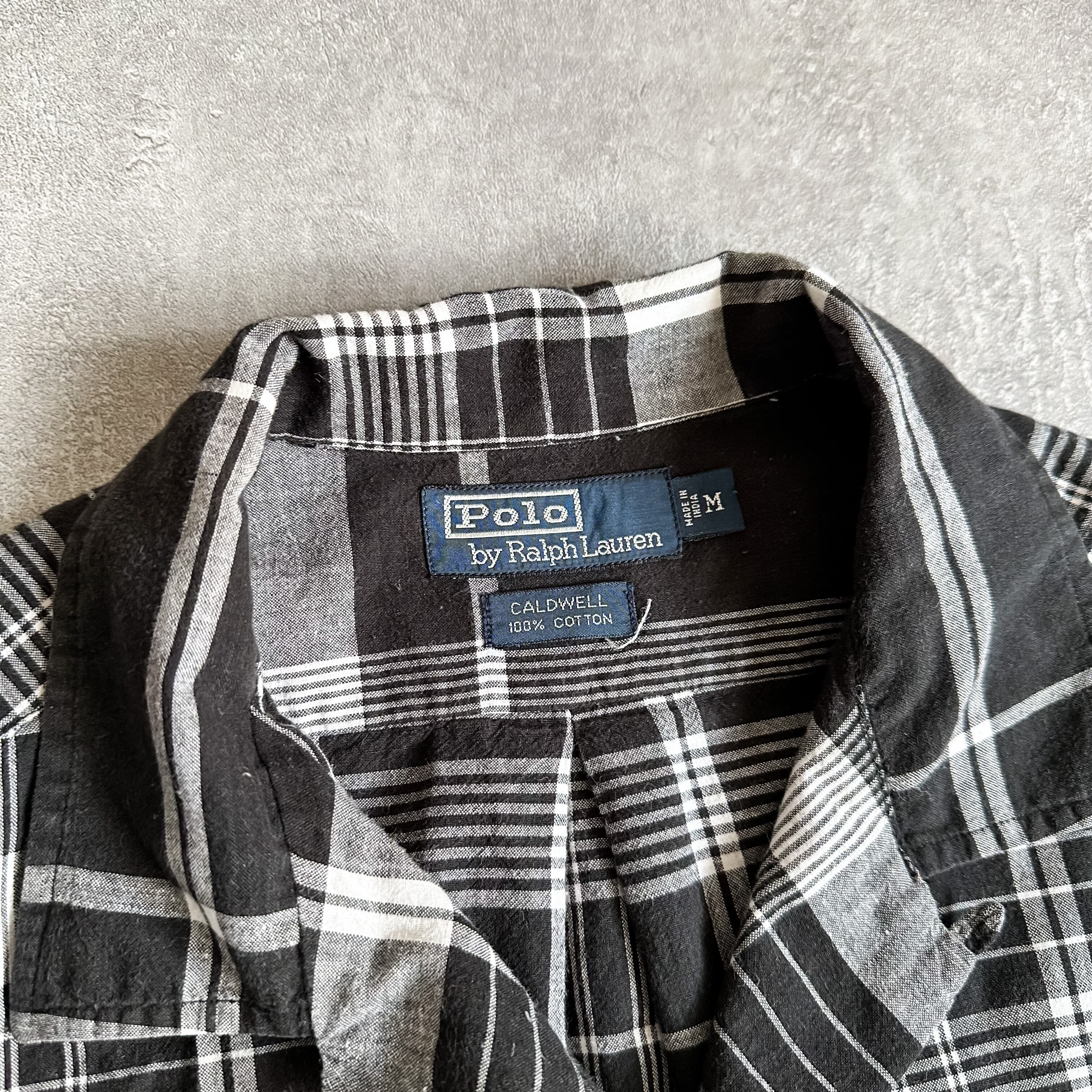 1990's "Polo Ralph Lauren" CALDWELL monotone plaid pattern open collar cotton S/S shirt