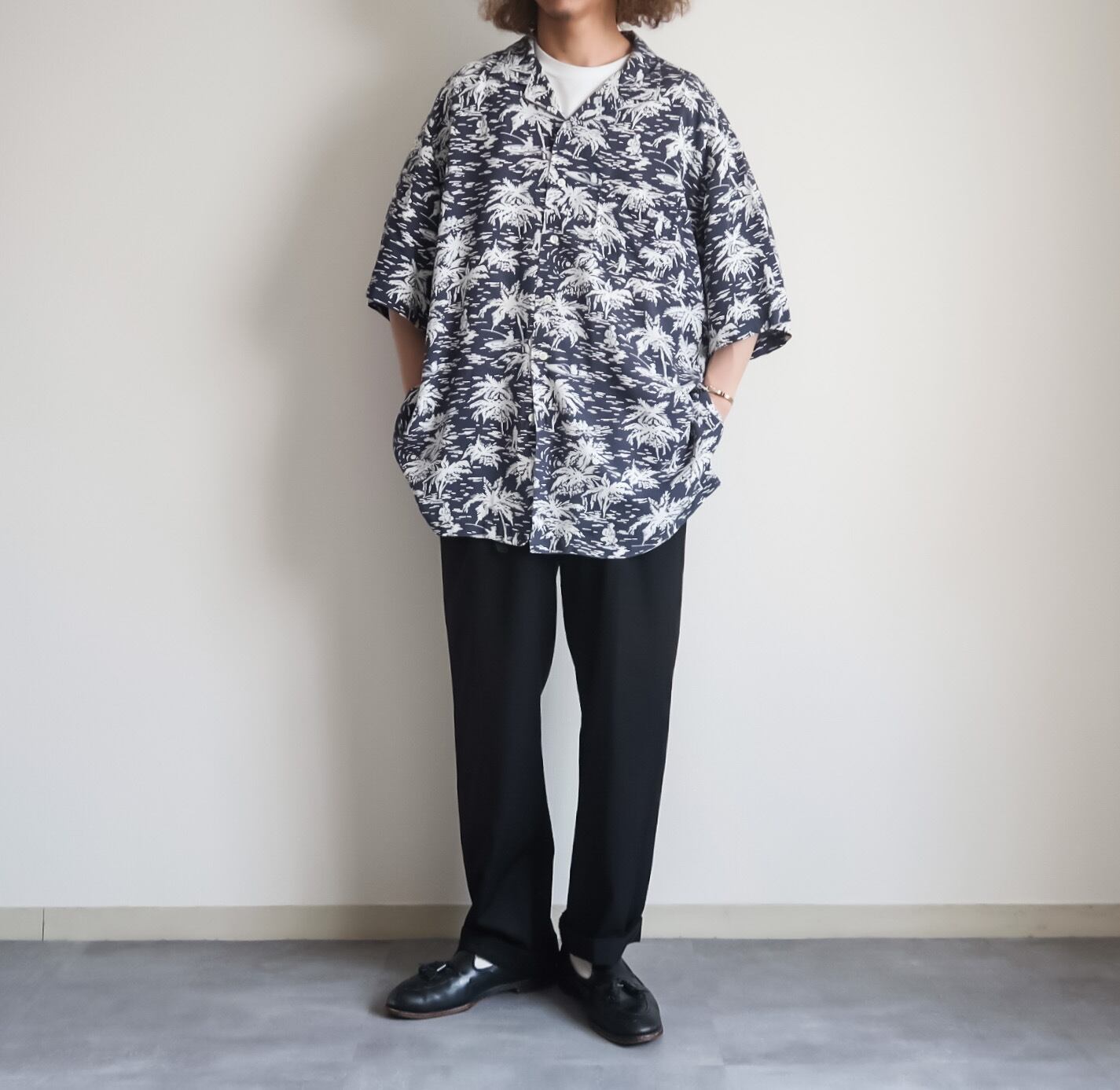 ヤシの木やカヤックで釣りをしている人など珍しいテキスタイルが全面にプリントされた素晴らしいハワイアンです。