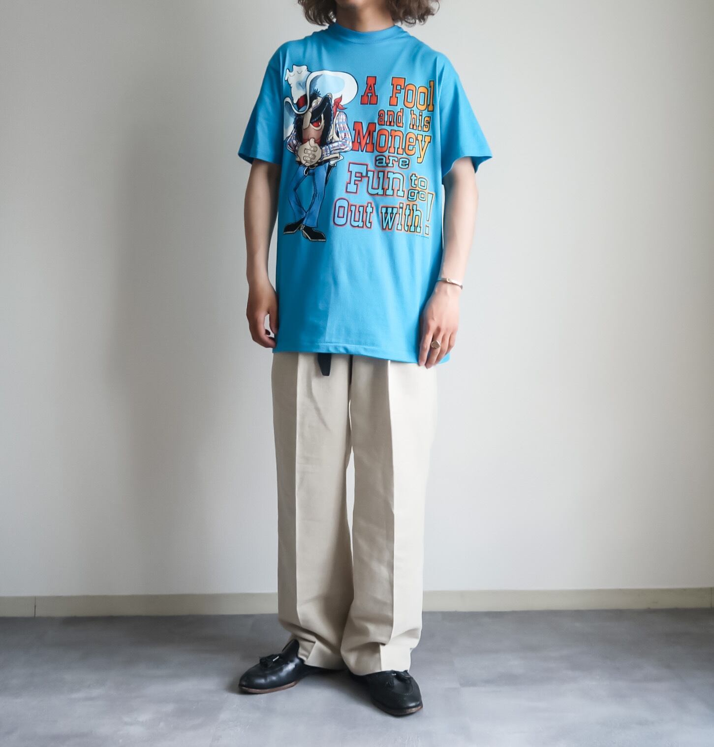 ライトブルー系のカラーにコミカルなウエスタンキャラクターが大きくプリントされた古着らしいユニークな一枚。