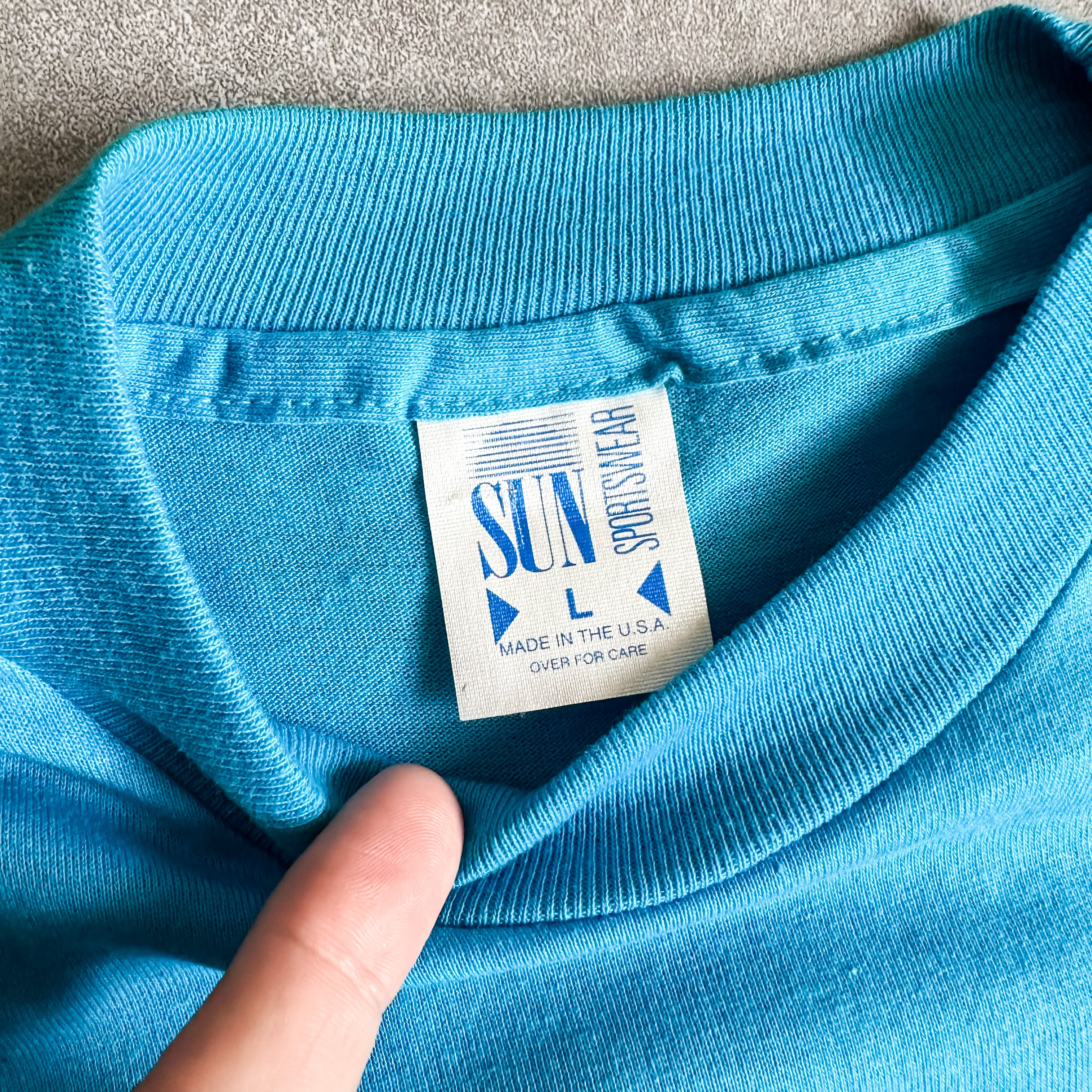1980's~ "SUN SPORTS WEAR" light blue print tee made in USA
