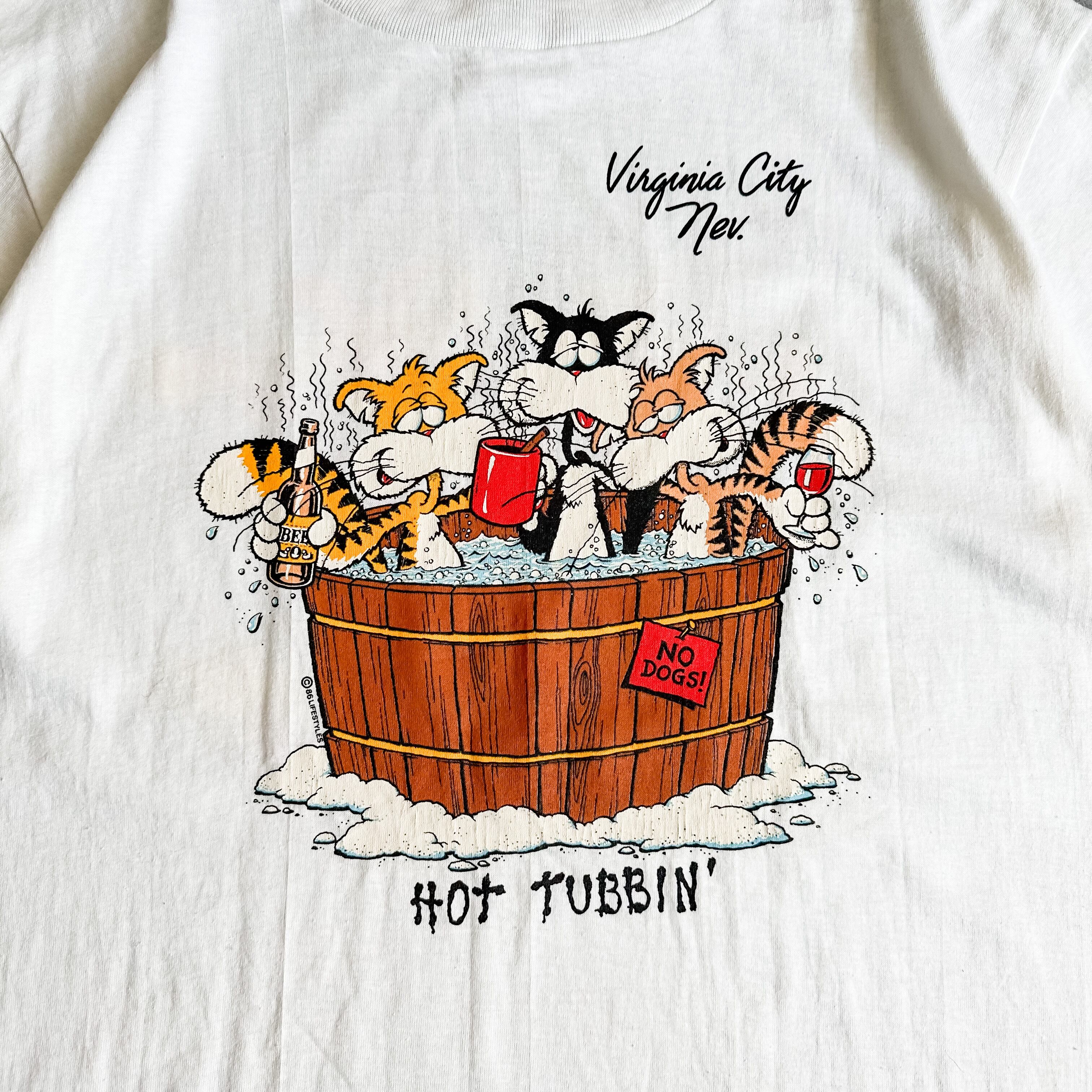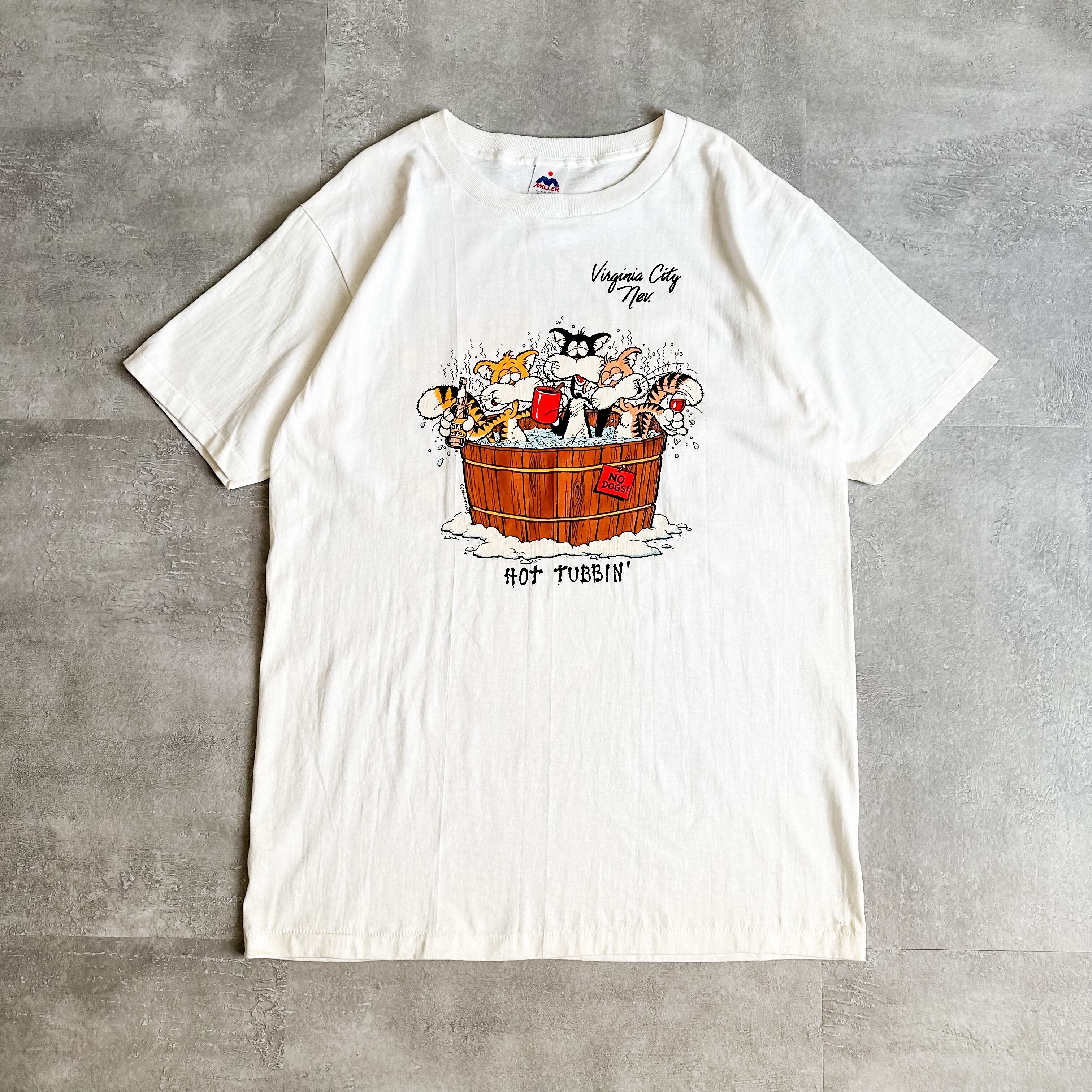ホワイトカラーに入浴中しながらお酒を飲む猫がプリントされた古着らしいユニークな一枚。