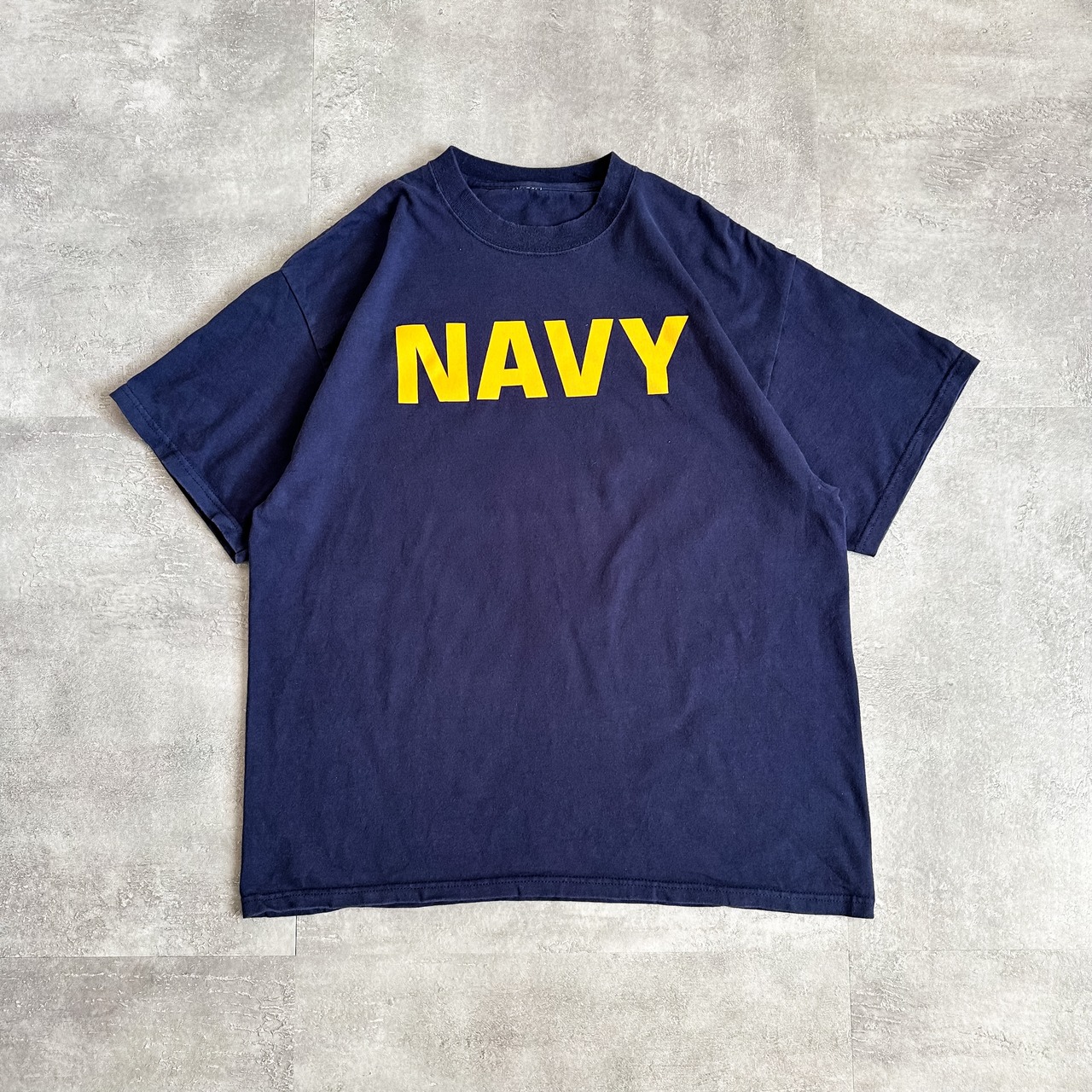 ネイビーカラーのハリのあるコットンボディーに、フロントにはイエローの"NAVY"がプリントされたシンプルながらも良い一枚です。