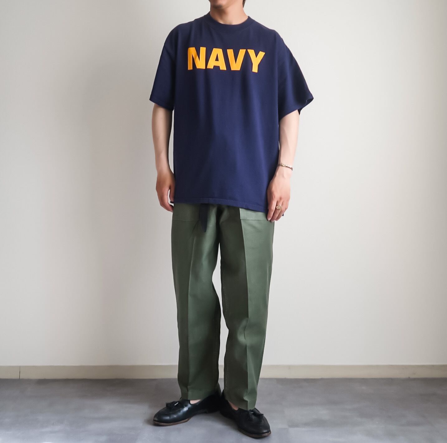 定番なARMY Tシャツと比べて球数の少ない印象の"NAVY"のプリント。