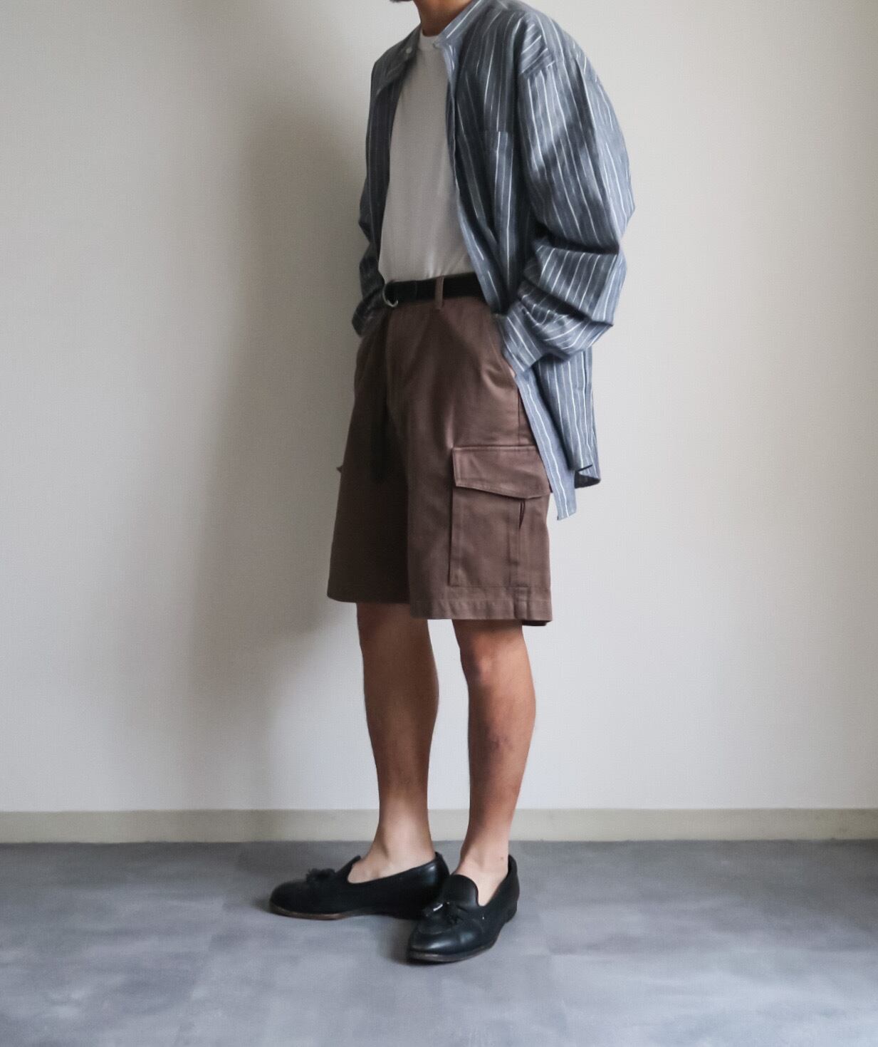 ミリタリーのようなオリーブ系のカラーリングに、サイドカーゴポケットの付くディテールの一本。