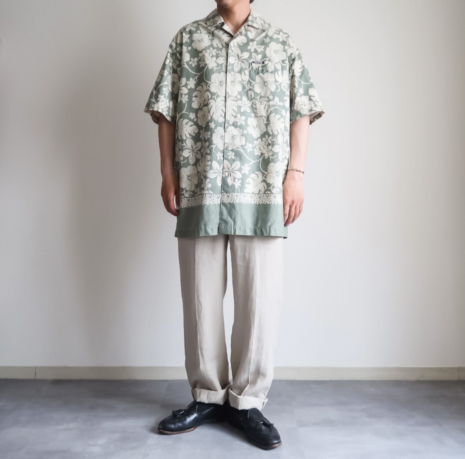 グリーン系のカラーリングに、大きな独特なボタニカルパターンがグッドな一枚です。