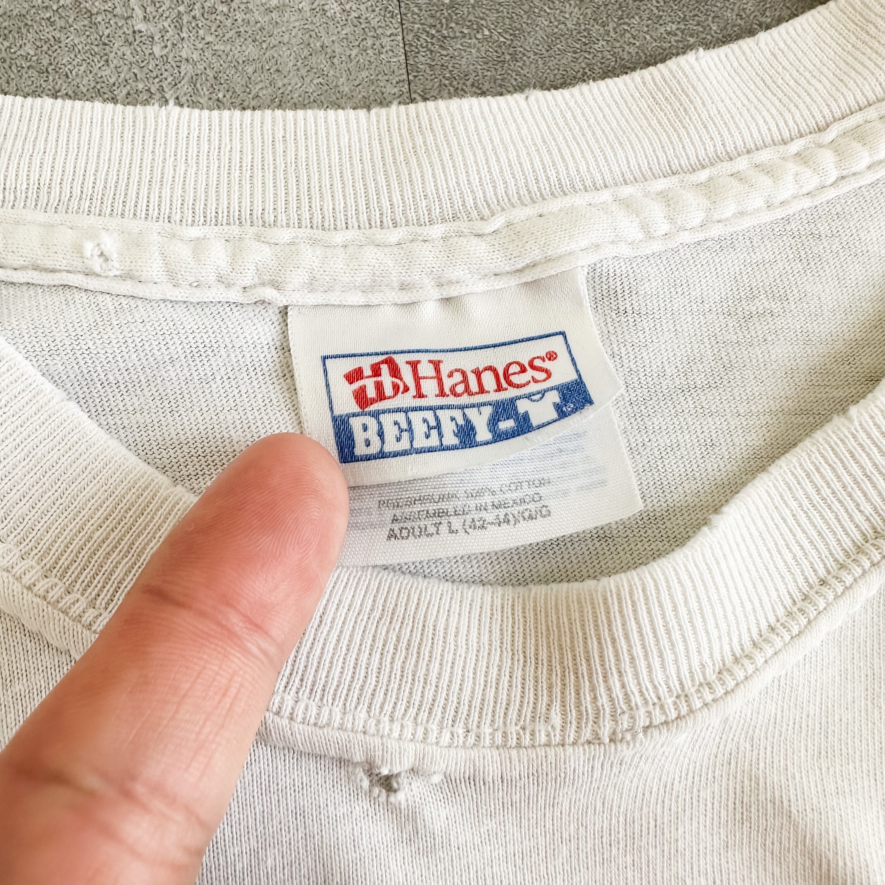 Hanesのオールコットンボディーに、袖裾ダブルステッチ。