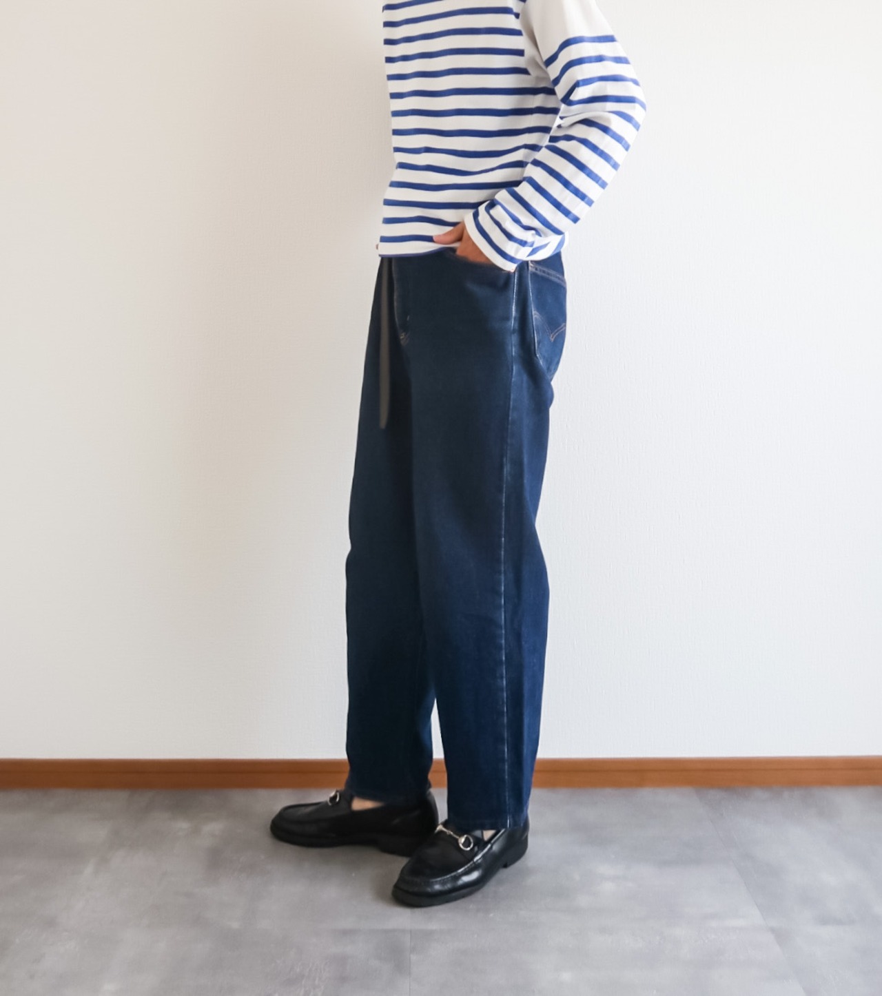 太もも周りはゆったりで裾にかけてテーパードがかかる絶妙なシルエットは550ならでは。