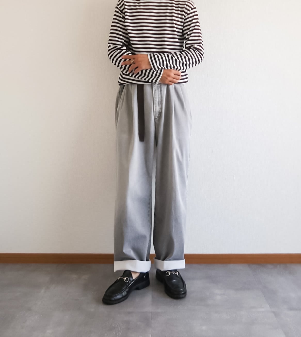 造りはDOCKERSのツータックパンツと一緒で、恐らくチノなんですが見た目はグレーデニムのようなルックスが素晴らしい一本です。