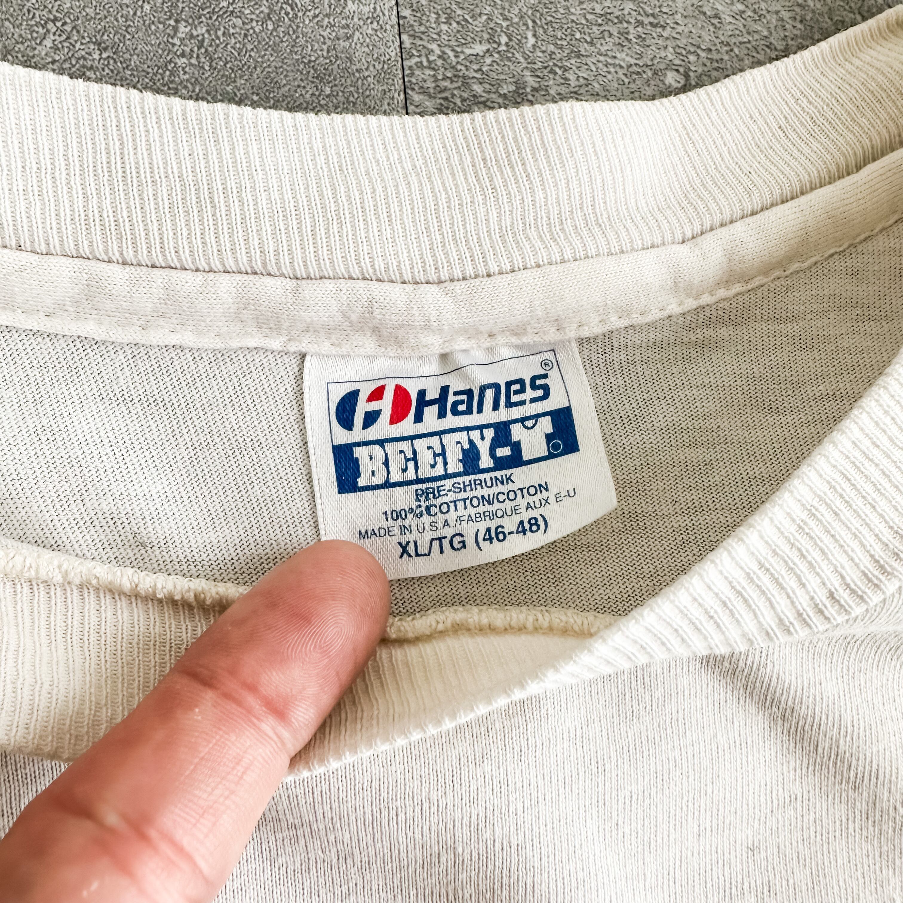 Hanesのオールコットンボディーに、袖裾シングルステッチ。