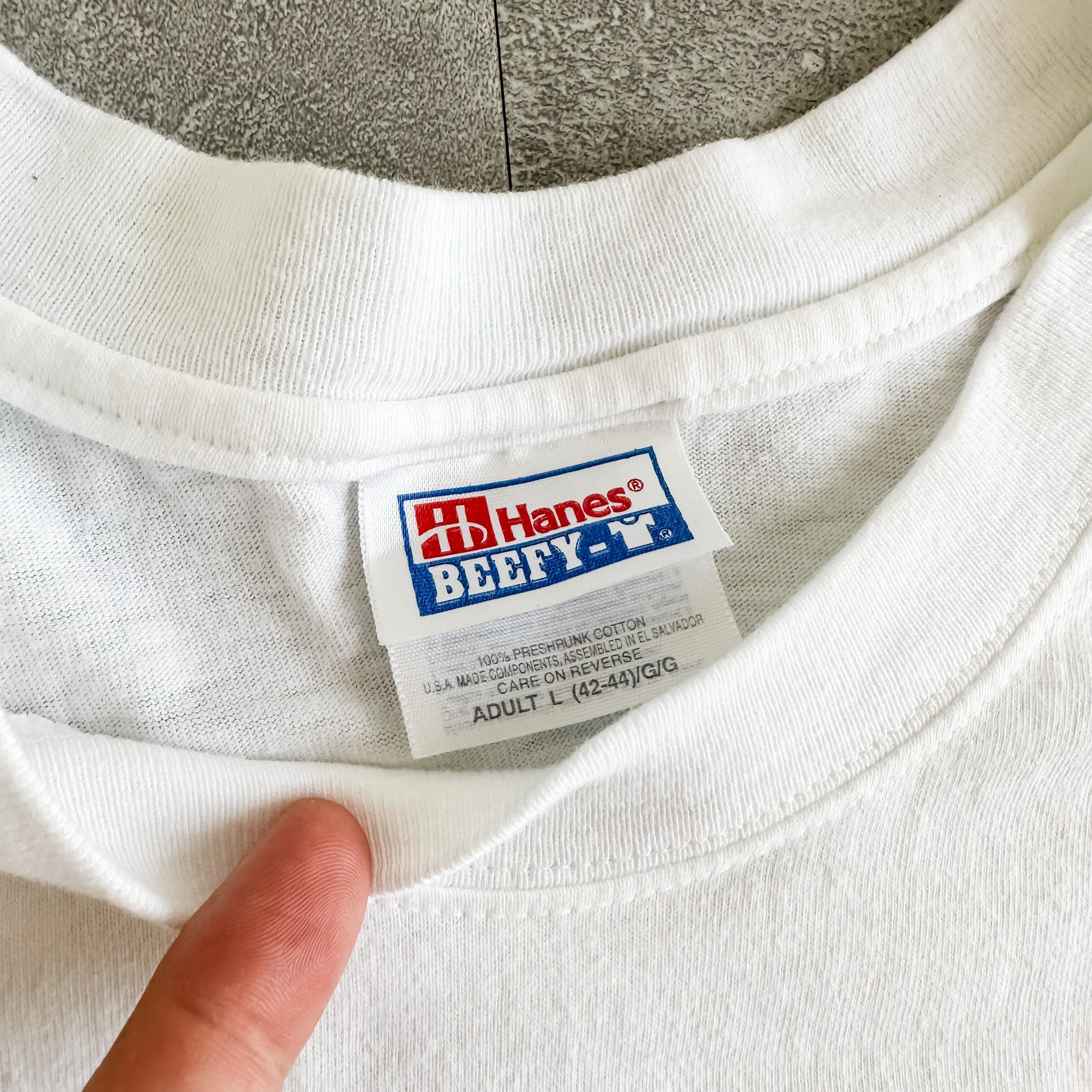 Hanesのオールコットンボディーで、袖裾ダブルステッチ。