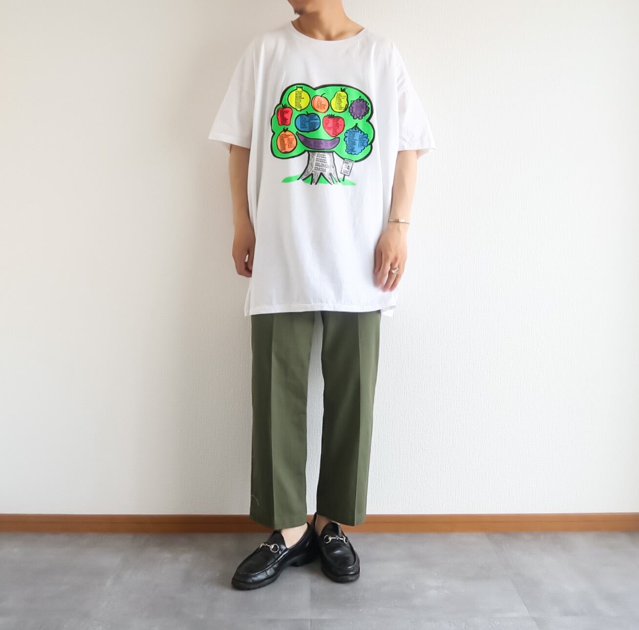ホワイトカラーに、フロントにはポップなカラーリングのフルーツの木がプリントされた一枚。