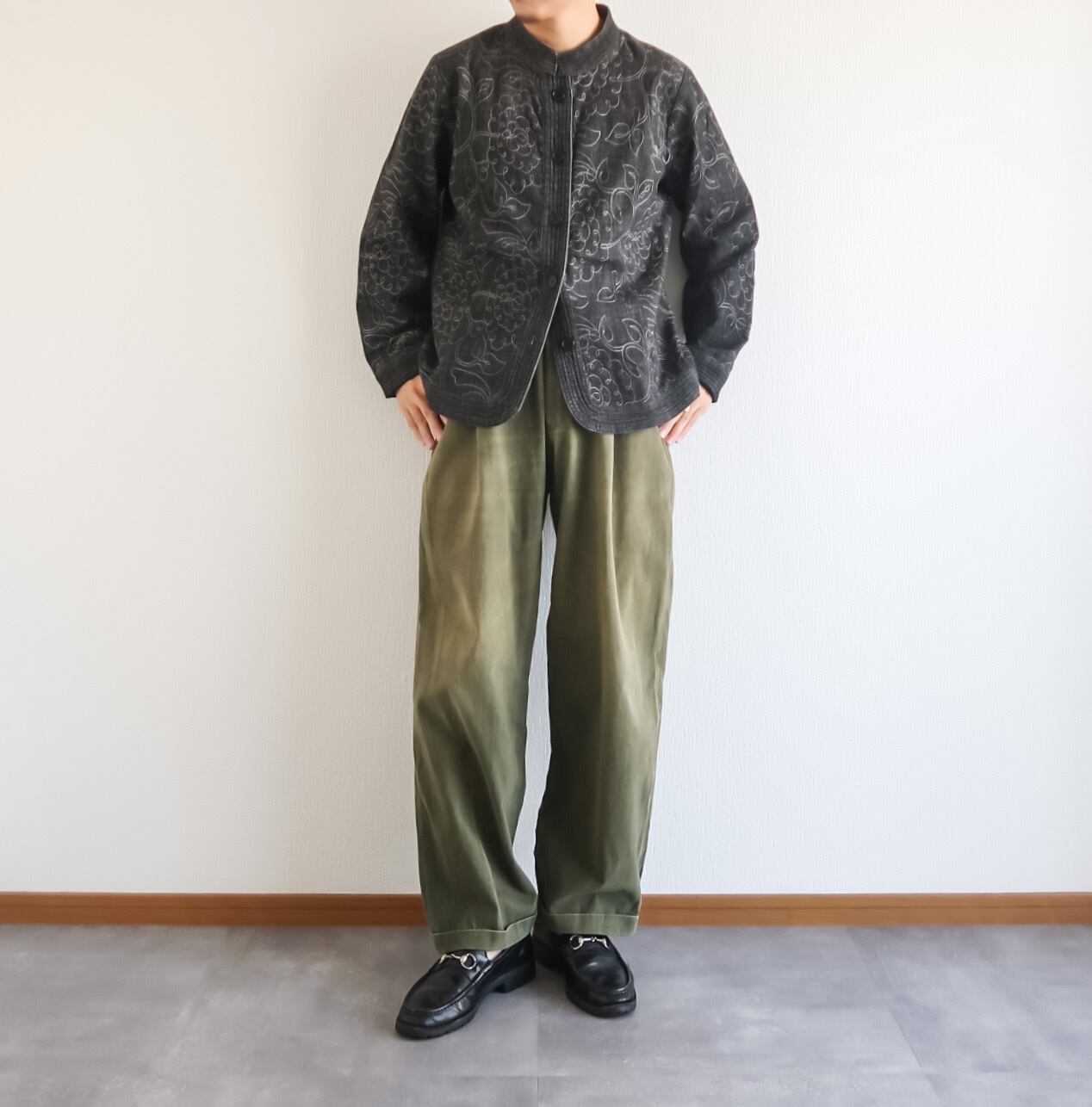 この少し雑なボタニカル柄の刺繍は古着らしくて心くすぐられますね。