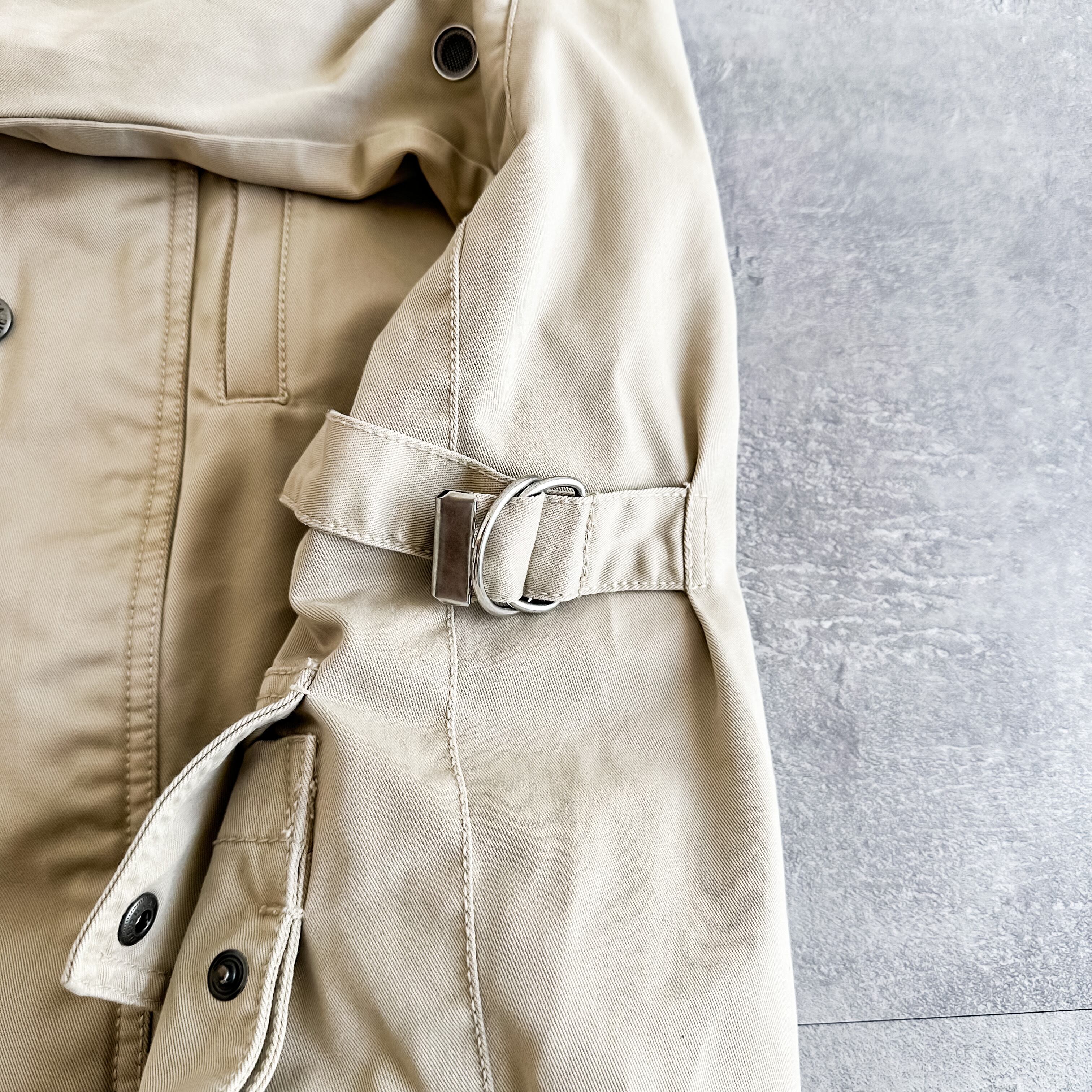 フロントはスナップ仕様の比翼仕立てで内側にはジップ、サイドのアジャスターやエルボーパッチが付くなどパナリパらしい面白いディテールが詰まっています。