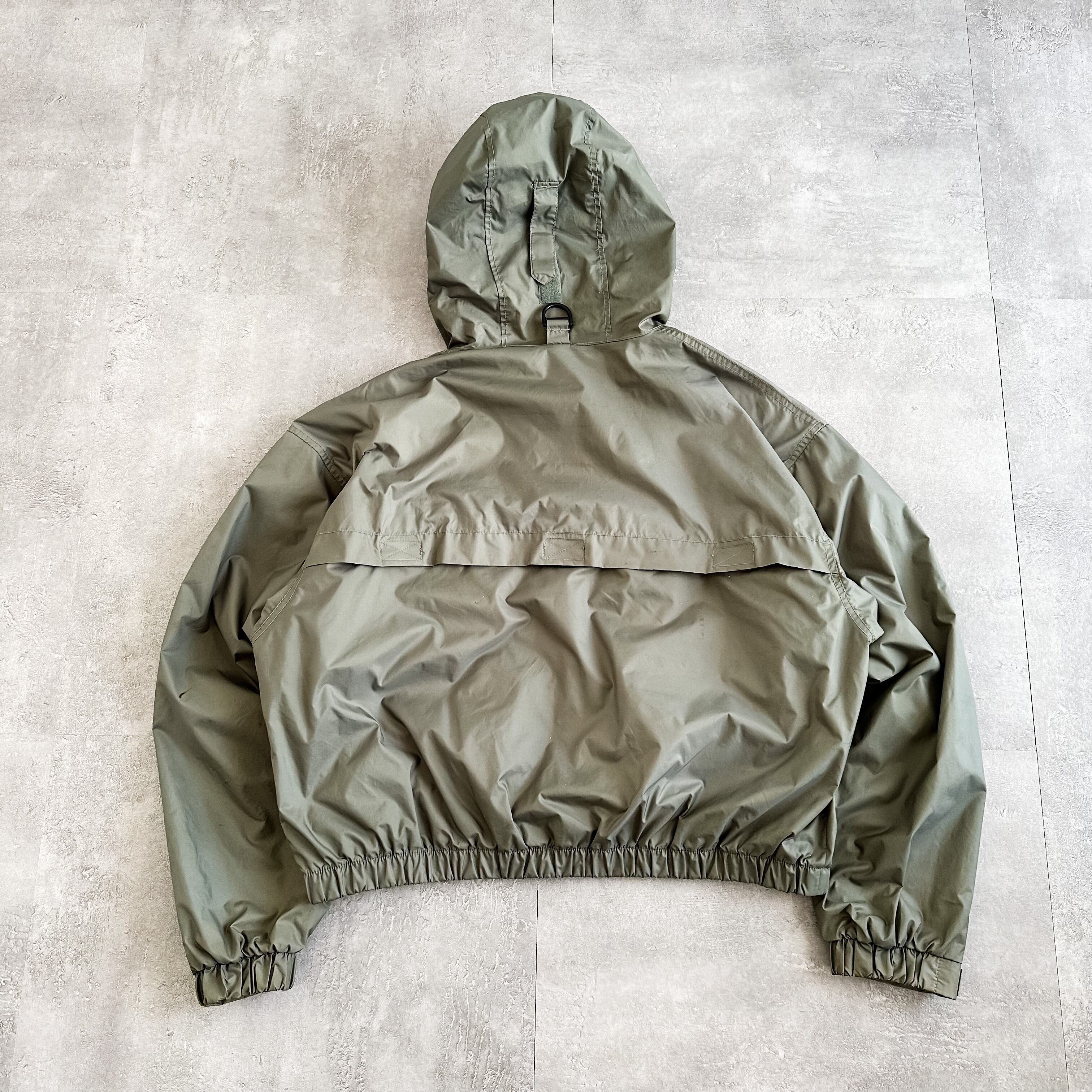オリーブ系のカラーリングのナイロンボディに、短めな着丈や大きめのポケットが目を引く一着。